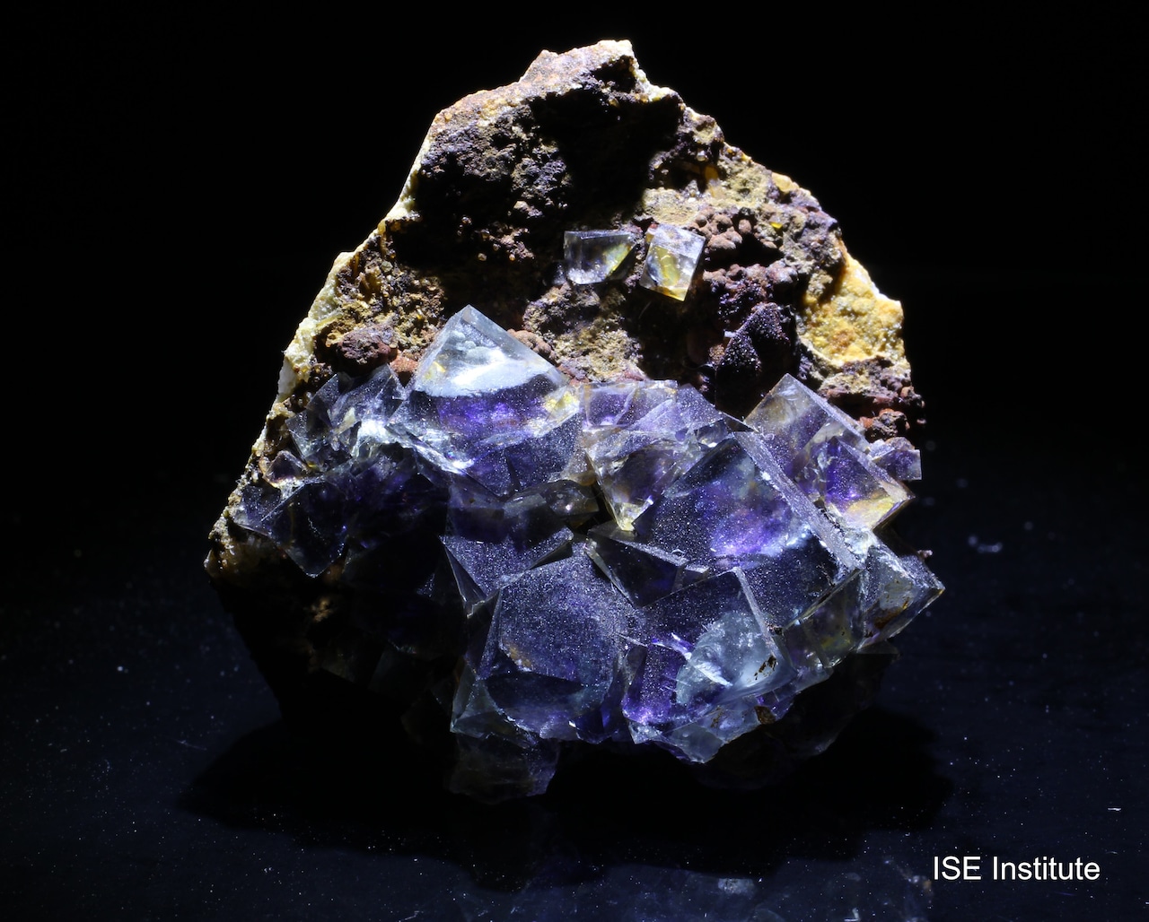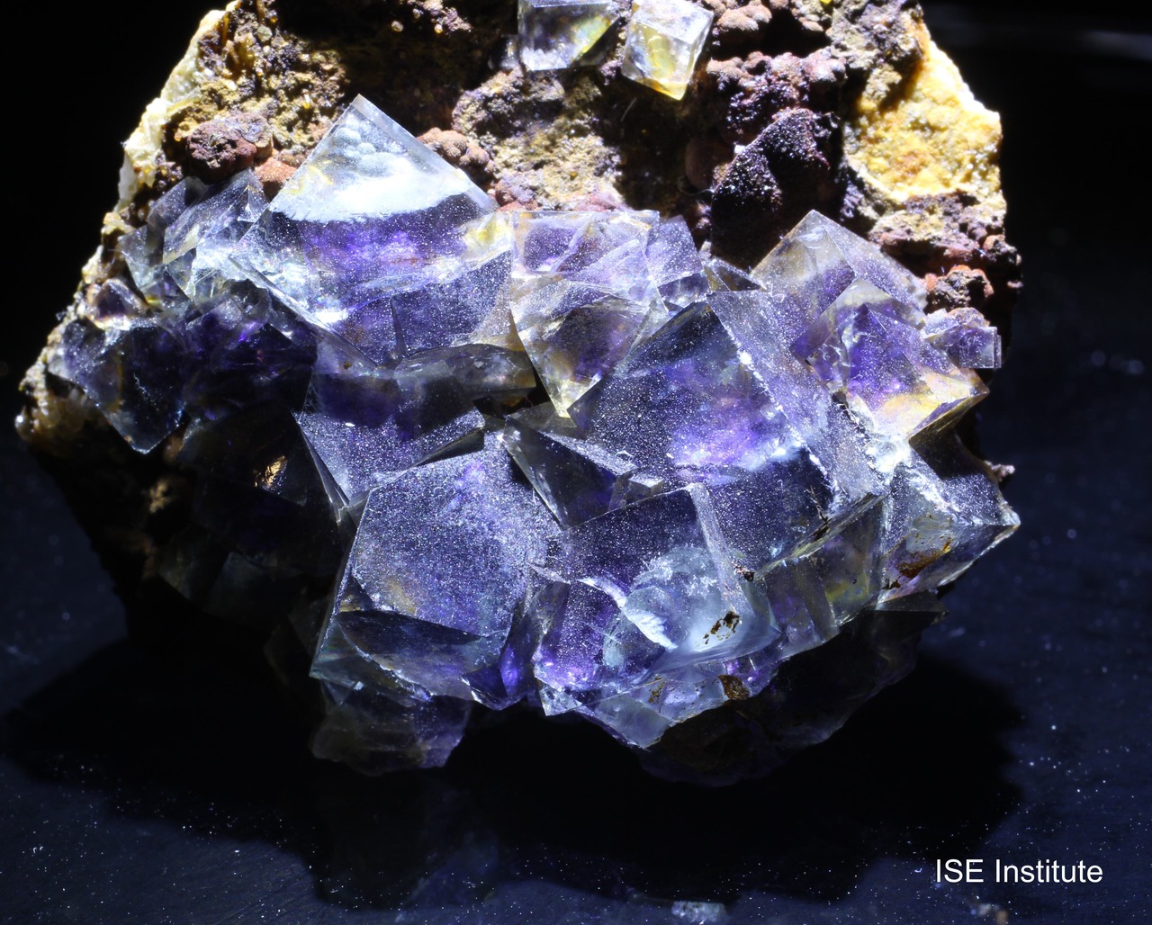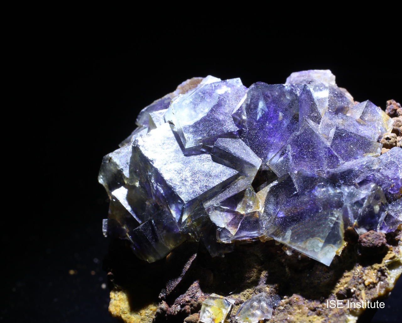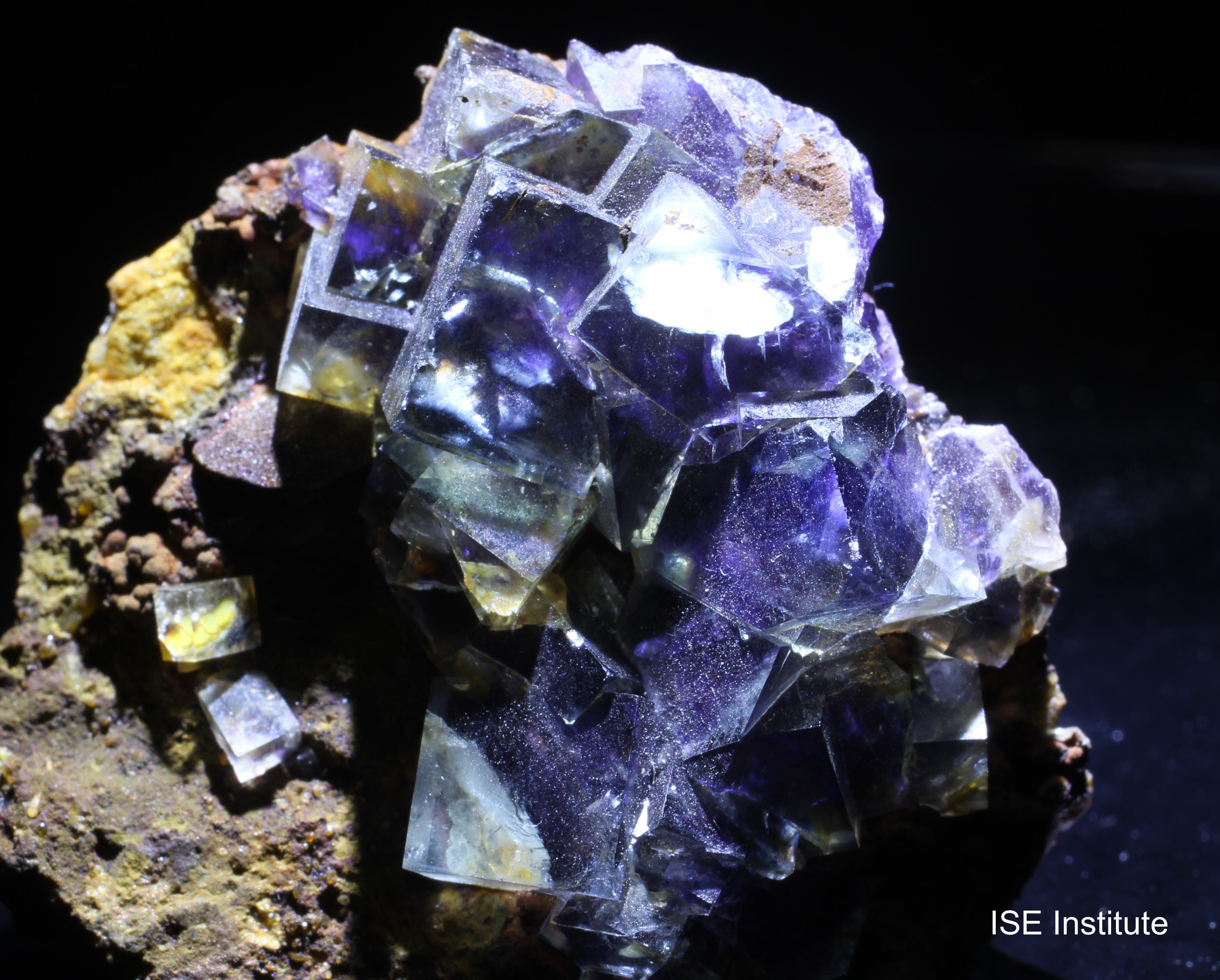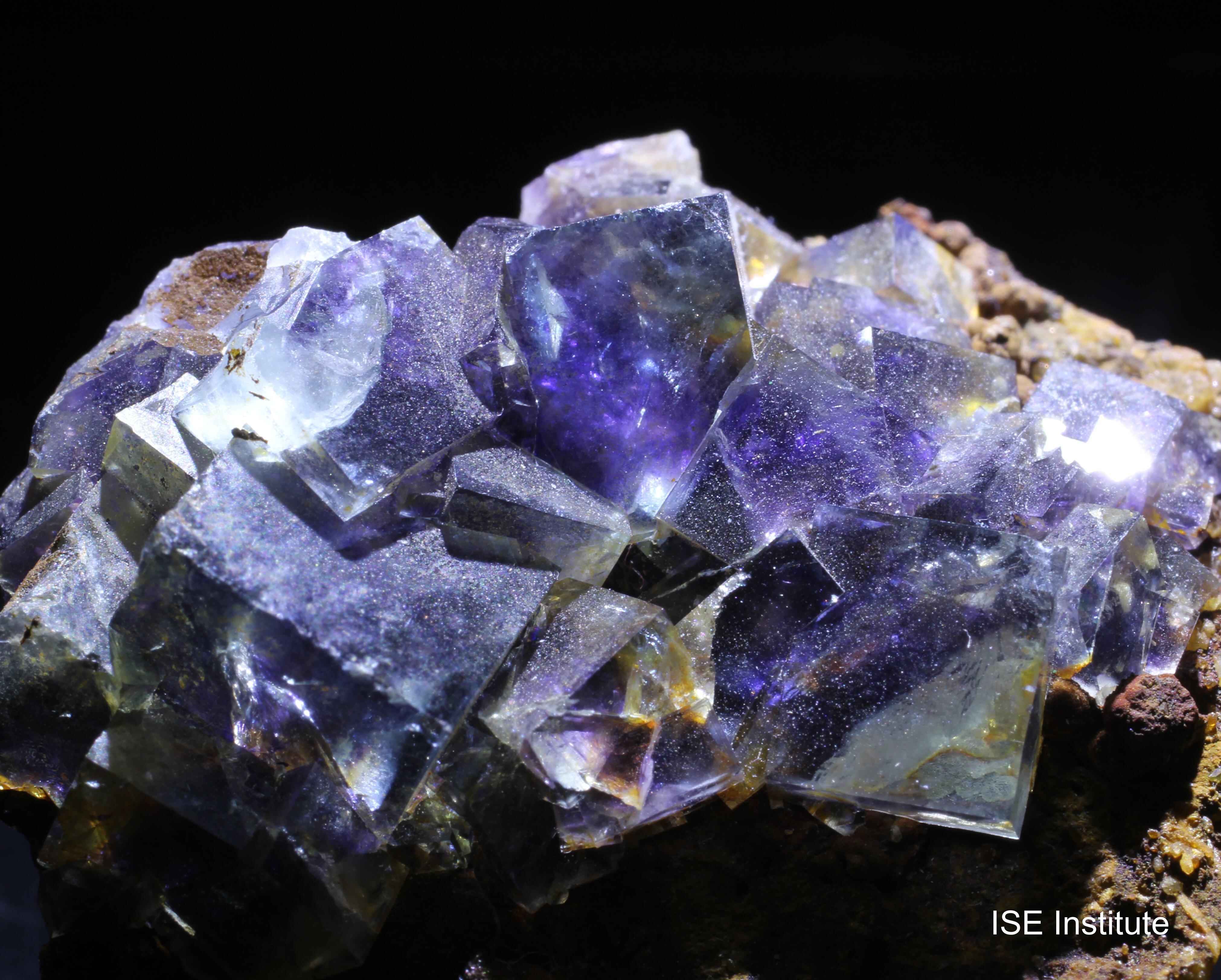 インドゥ鉱山(中国内モンゴル自治区チーフェン市ヘシグテン)産の蛍石は、銀・鉛・亜鉛鉱床に伴って産出し、複雑な結晶成長を示すことで注目されています。結晶は立方体形態を基本としつつ、内部に紫や緑のファントムが形成されることが多く、透明度の高い青色結晶の内部に紫色の雲状構造が見られる例もあります。また、結晶表面は光沢が強く、照明によって内部のゾーニングが際立ち、まるで水槽を覗き込むような効果を与えると評されます。インドゥ鉱山の蛍石は、2020年代に採掘された標本群が特に知られ、他地域の蛍石とは異なる独自の美しさを備えています。