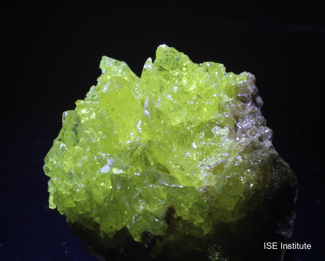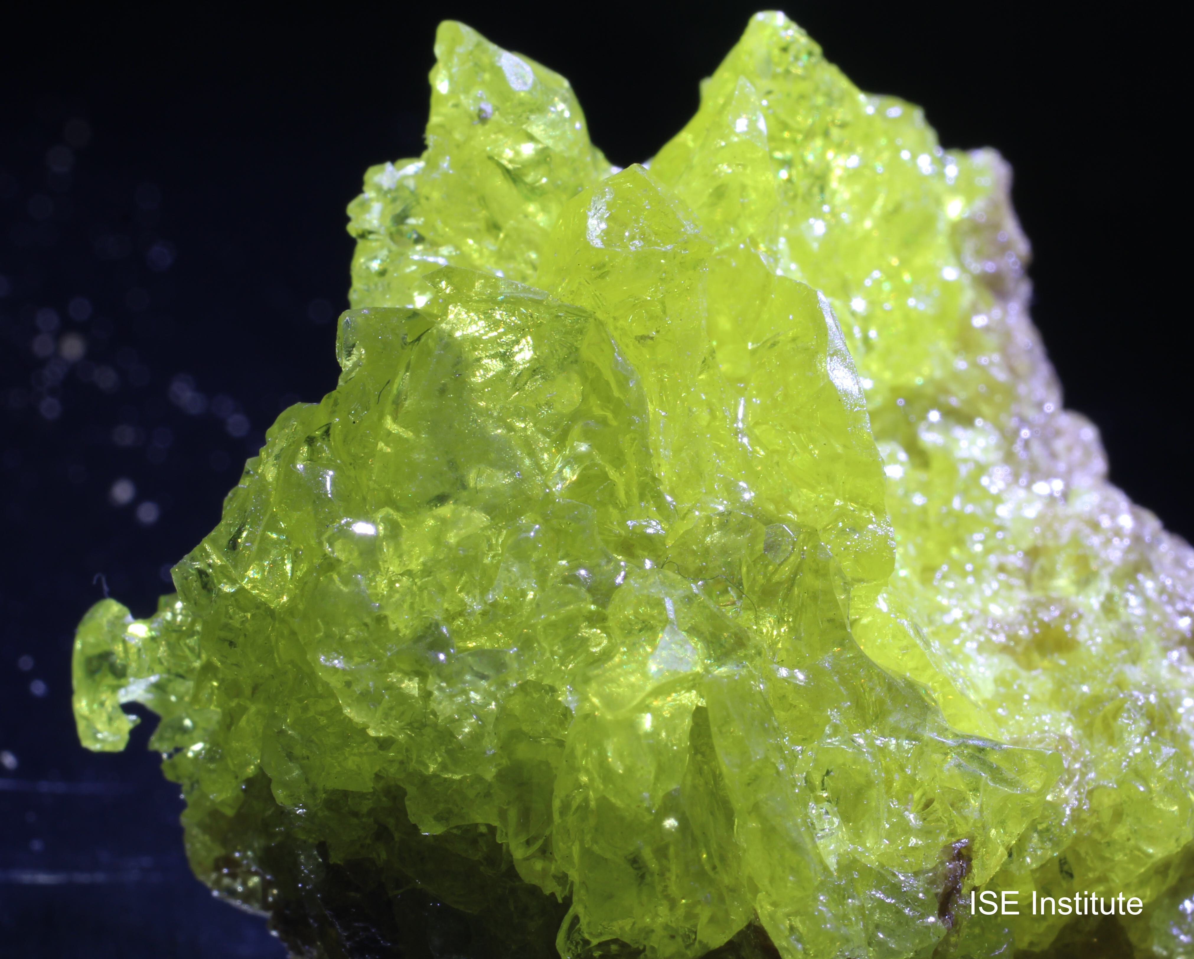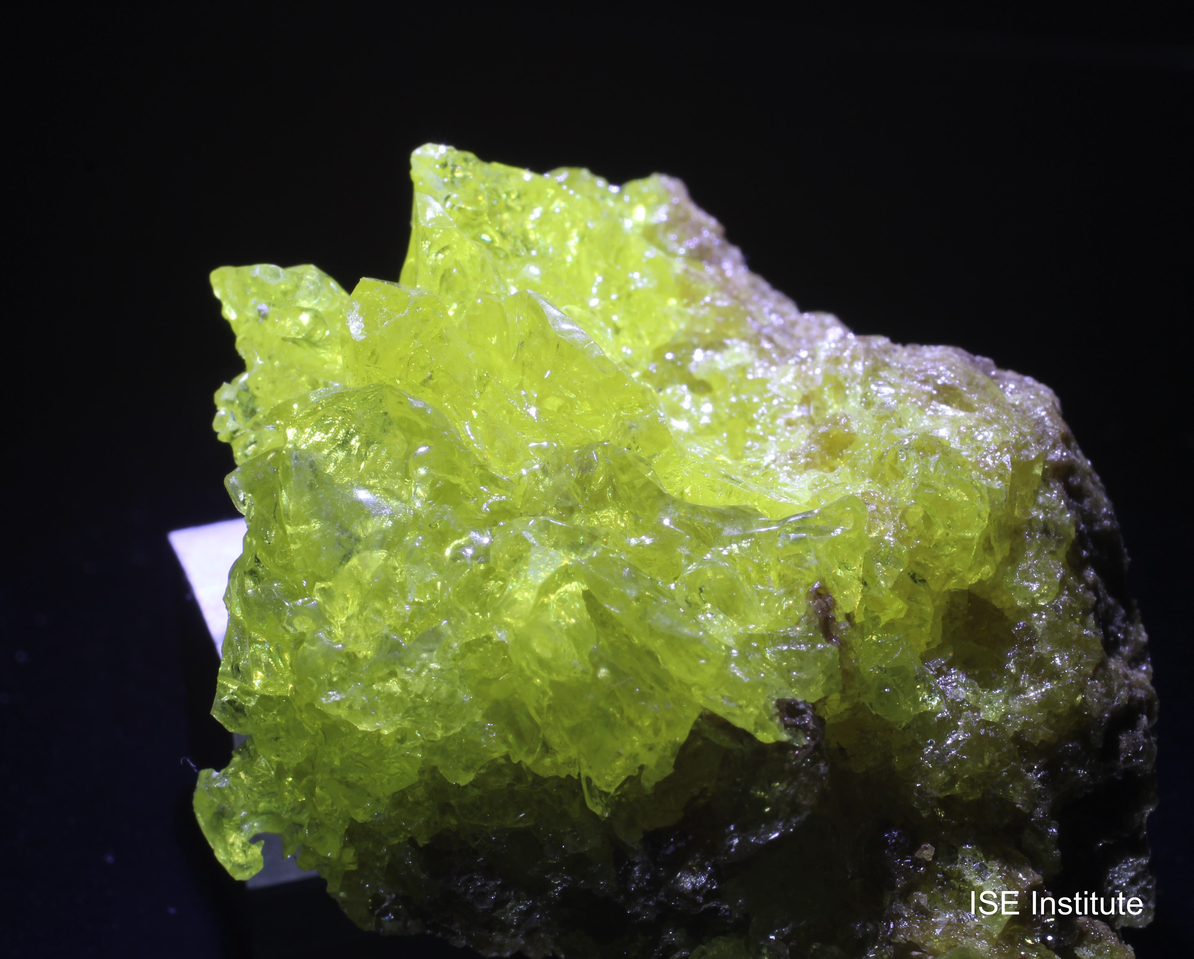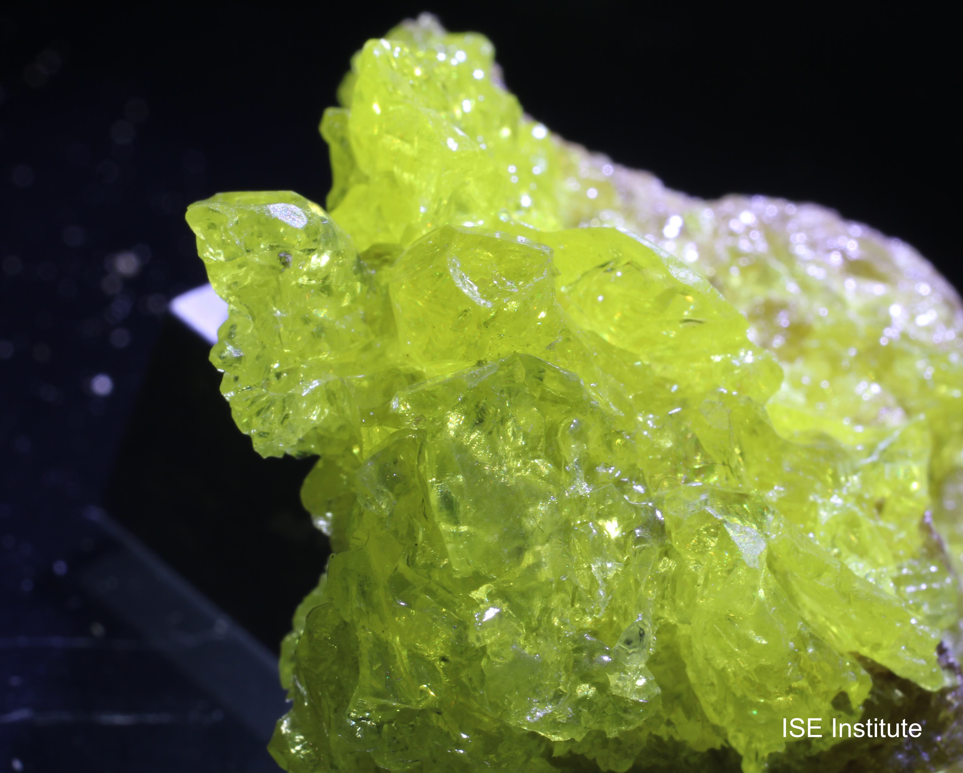 エル・デシエルト鉱山は、ボリビア西部アンデス山脈の火山帯に位置し、ウユニ塩原に近い硫黄鉱床の一つです。この地域の硫黄は、火山性ガスの沈殿によって形成され、火山灰や石膏を母岩として結晶化します。通常、硫黄は塊状で産出することが多いですが、この鉱山では透明感を伴う硫黄が産出する点が特異です。結晶は立方体や骨格状の形態を示し、最大で数センチに達するものもあり、イタリア産硫黄に匹敵する世界的な標本として評価されています。結晶表面は光沢が強く、内部にわずかな亀裂や成長線が見られることがあり、産地特有の生成環境を反映しています。エル・デシエルト鉱山は、ボリビア国内約60か所の硫黄鉱床の中でも、良質な結晶を産する数少ない産地の一つとして知られています。