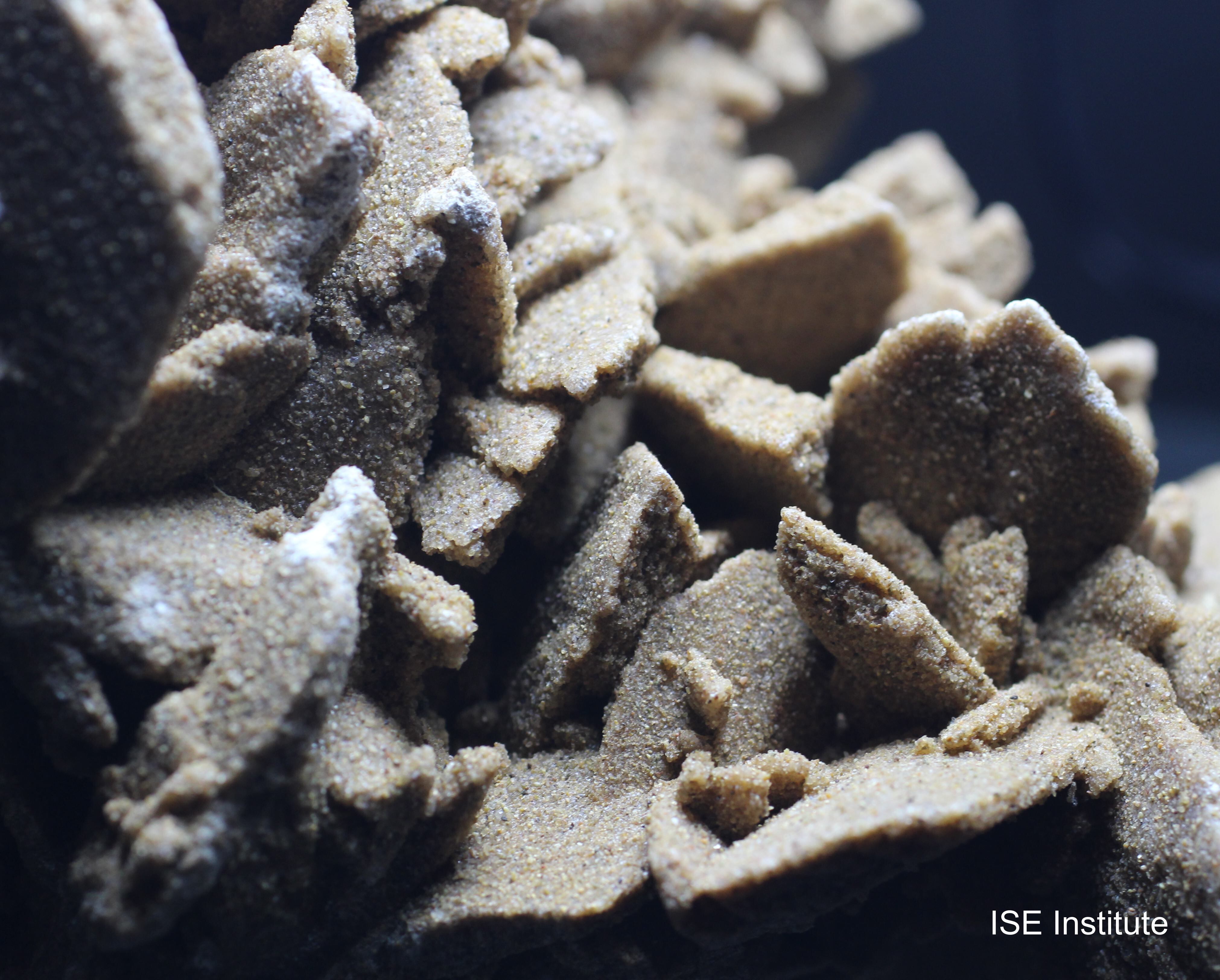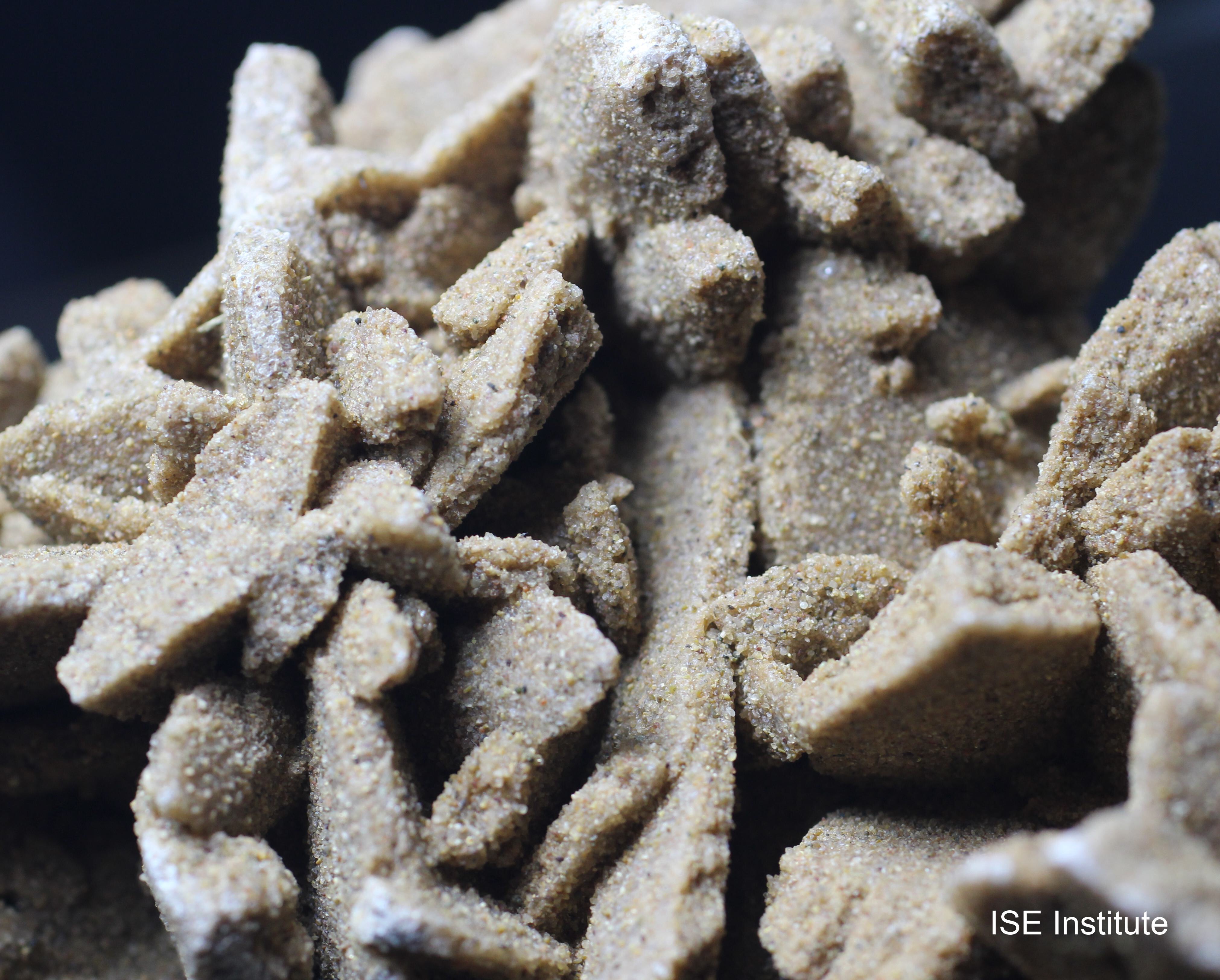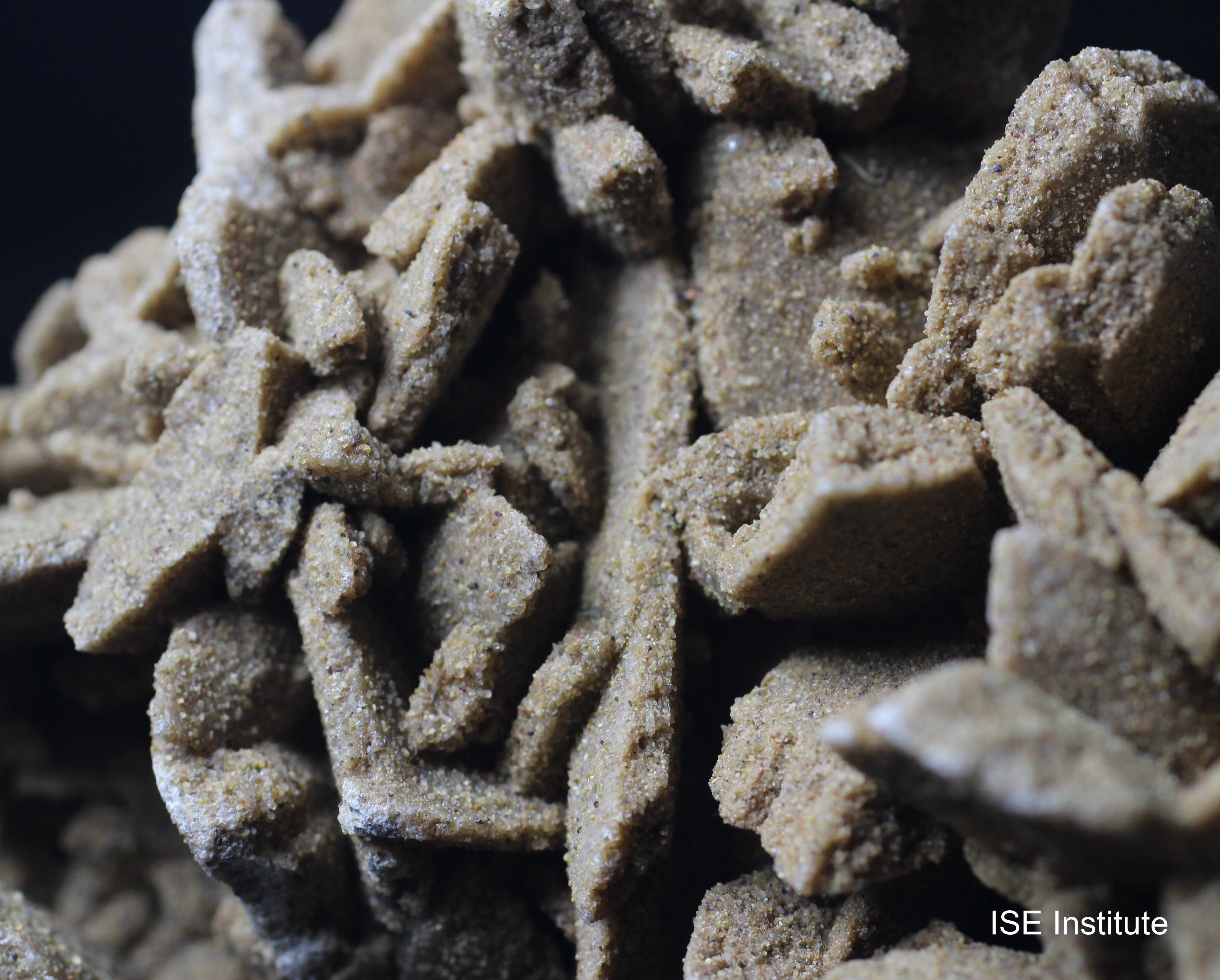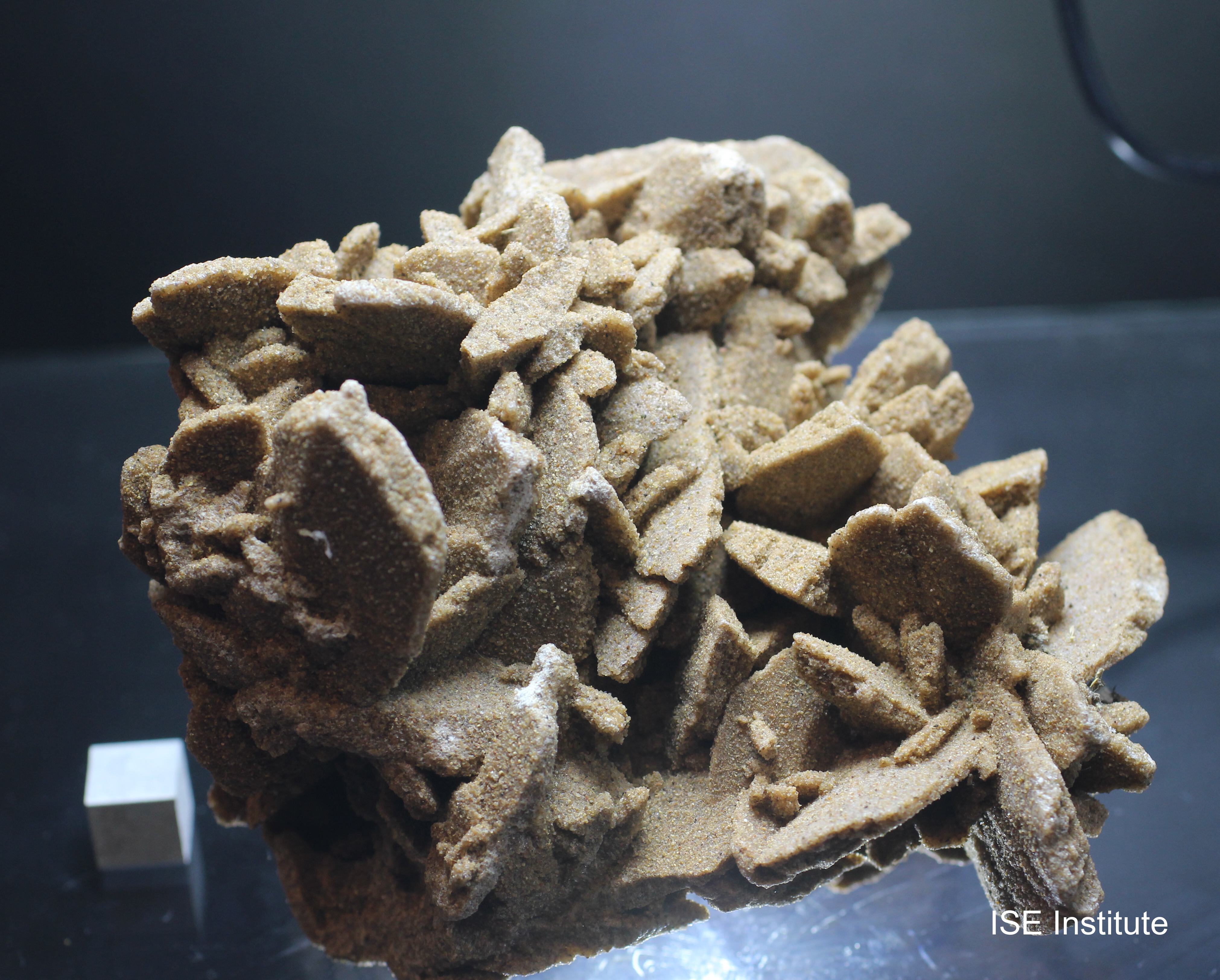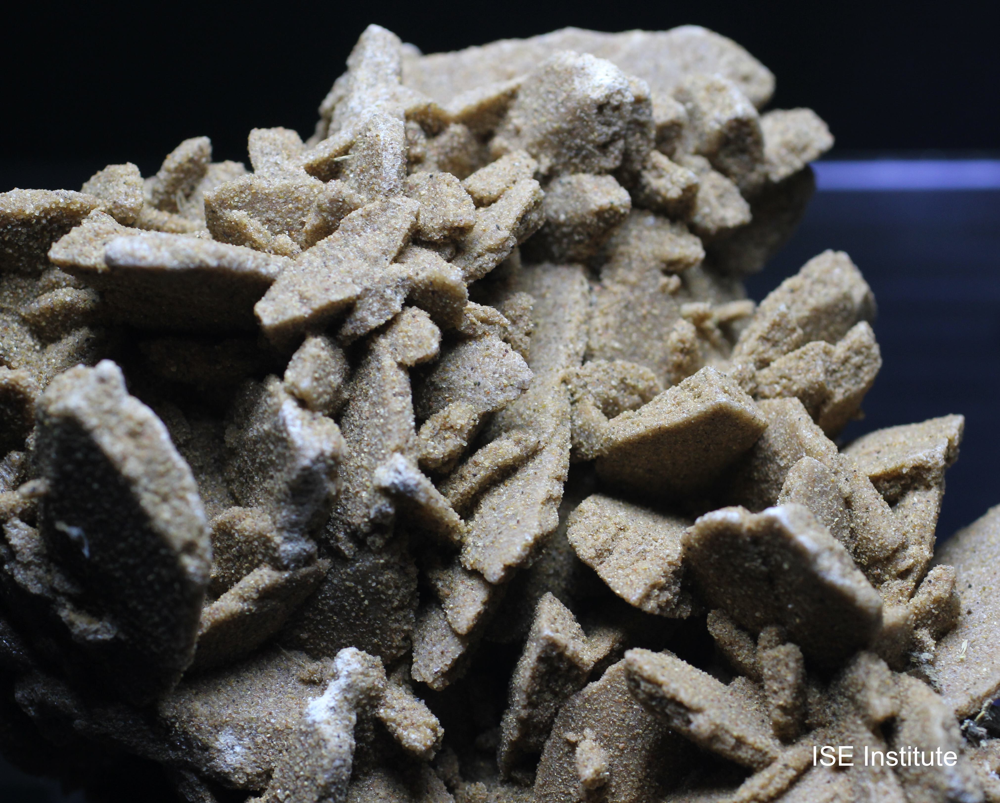 中国、内モンゴル自治区ゴビ砂漠産の石膏は、砂漠のバラと呼ばれる花弁状結晶を形成します。この産地の標本は、乾燥地帯における浅い塩湖の蒸発作用によって生成され、砂粒を取り込みながら放射状に広がる板状結晶が集合することで独特の形態を示します。サハラ砂漠産のものが広く知られていますが、ゴビ砂漠産は結晶の集合が大きく、複数の花弁が重なり合うように発達する点が特徴です。結晶はゴビ砂漠産の砂漠のバラらしい色合いと結晶形状であり、表面には砂漠由来の細粒が付着し、自然環境の痕跡を残しています。多くの結晶が密集して形成されるため、全体として迫力ある造形を呈し、産地固有の美しさを備えています。