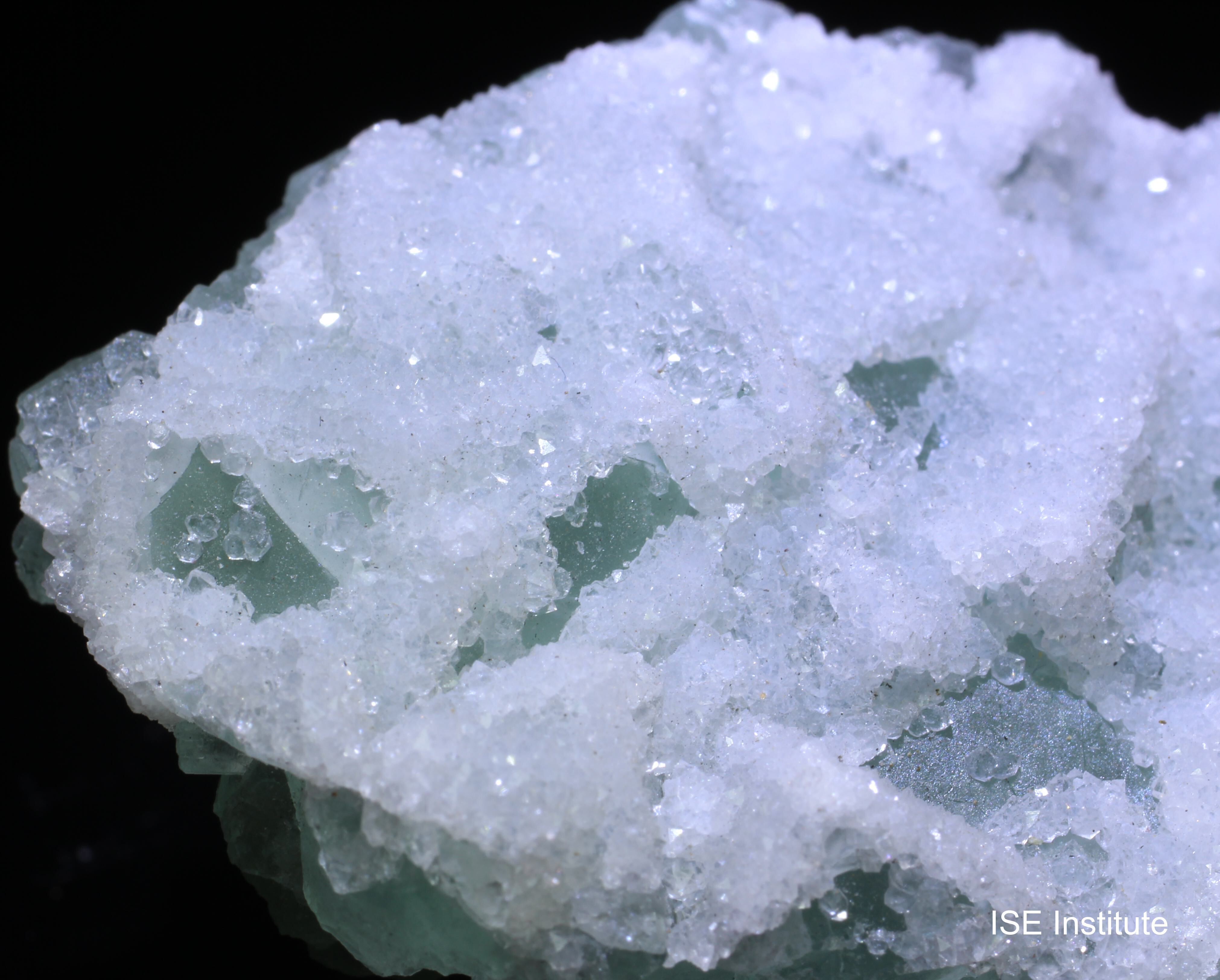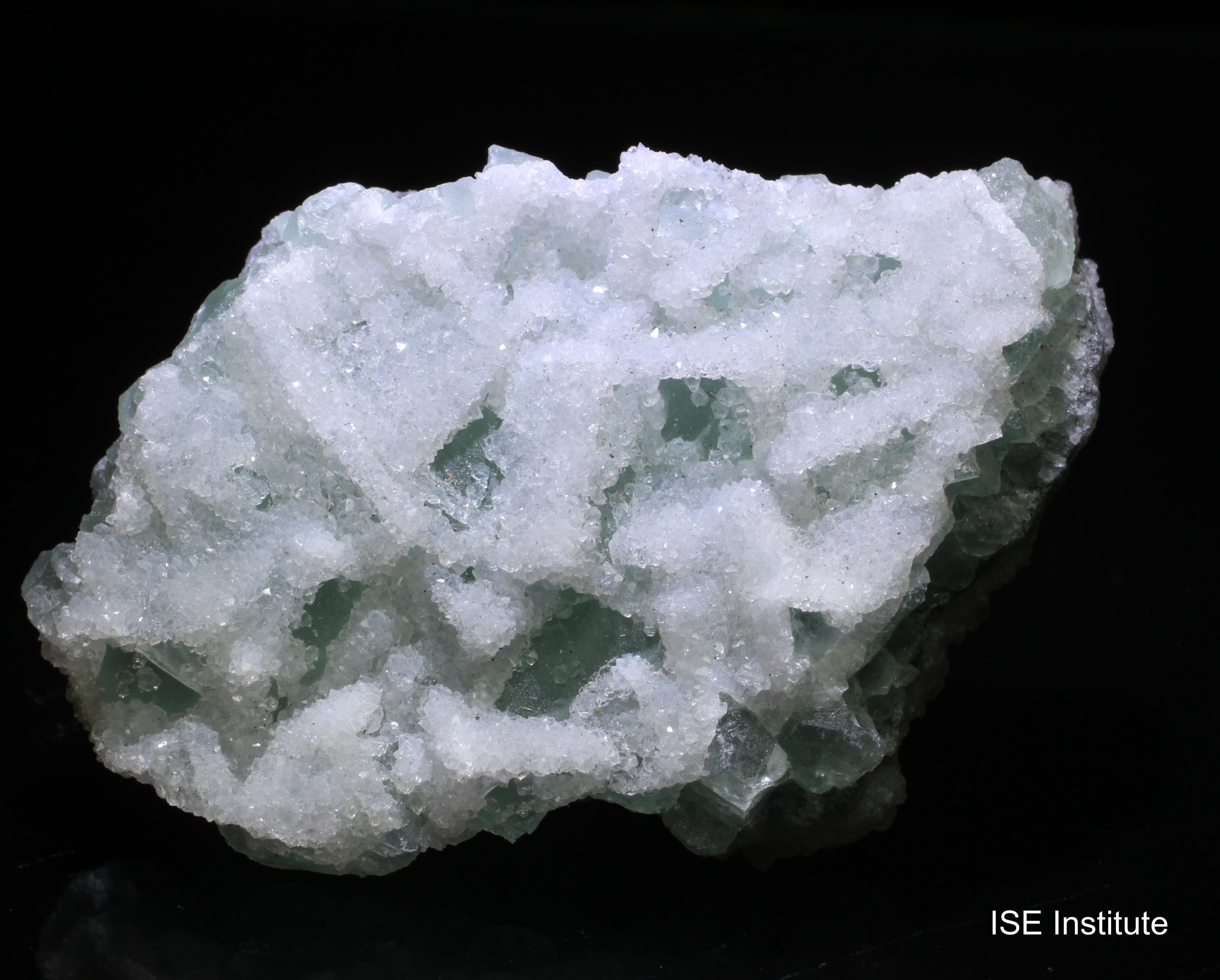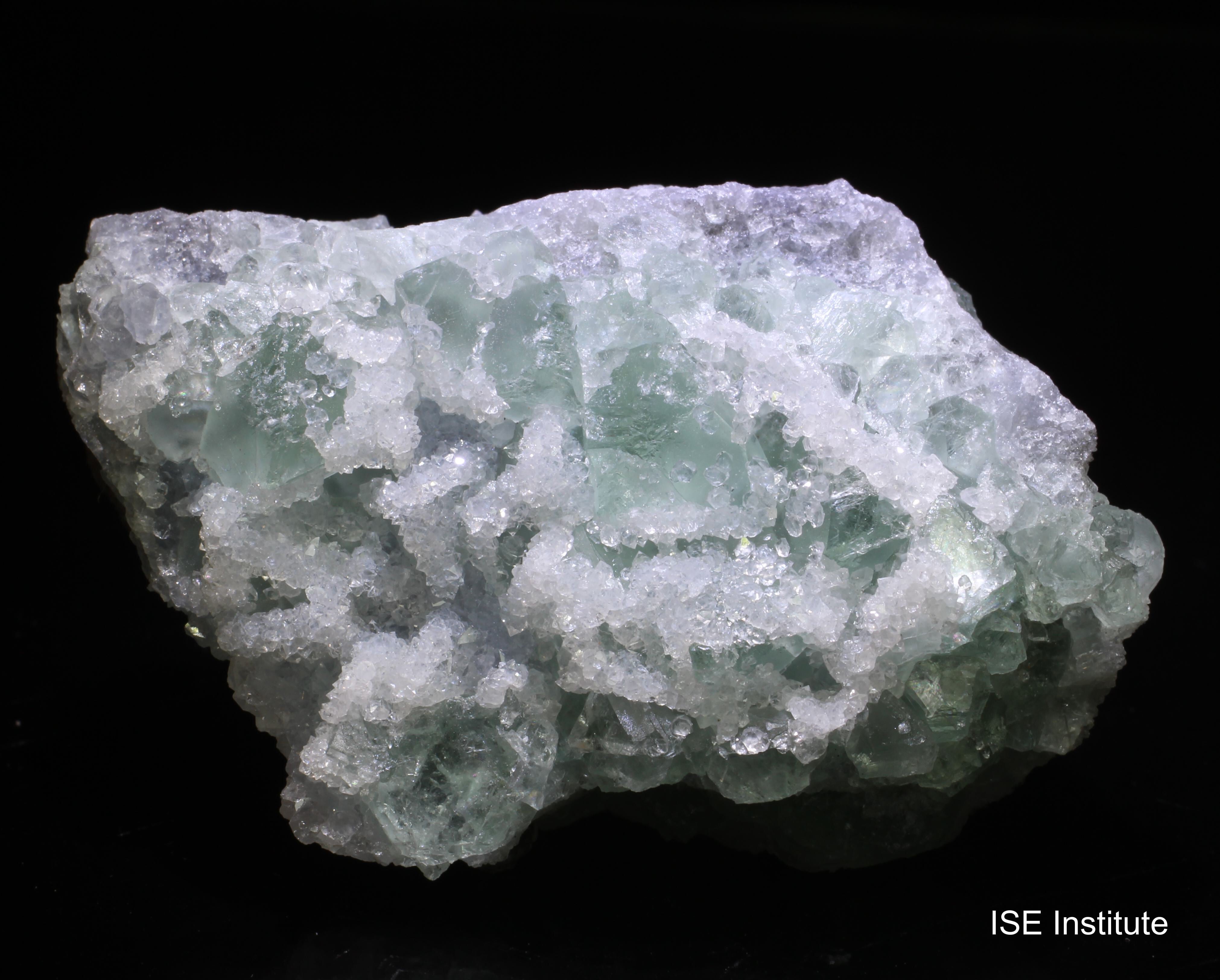 福建省三明市大田県大田鉱山産の蛍石は、炭酸塩岩中の熱水脈や空洞で結晶化します。結晶習性は立方体から八面体が基本で、透明度が高く淡緑〜青紫の色調を示すことが多いです。本標本では蛍石結晶の表面に白色の別鉱物(石英または方解石)が付着しており、蛍石の透明部分と白色結晶のコントラストが明瞭です。表面はガラス光沢を示し、内部に成長線や微細なゾーニングが観察される場合があります(標本による)。大田鉱山は後期熱水活動の流体変化により透明で宝石質の蛍石と白色共生鉱物が同時に生成されやすい点が特徴で、産地特有の共生関係が標本の外観に反映されています