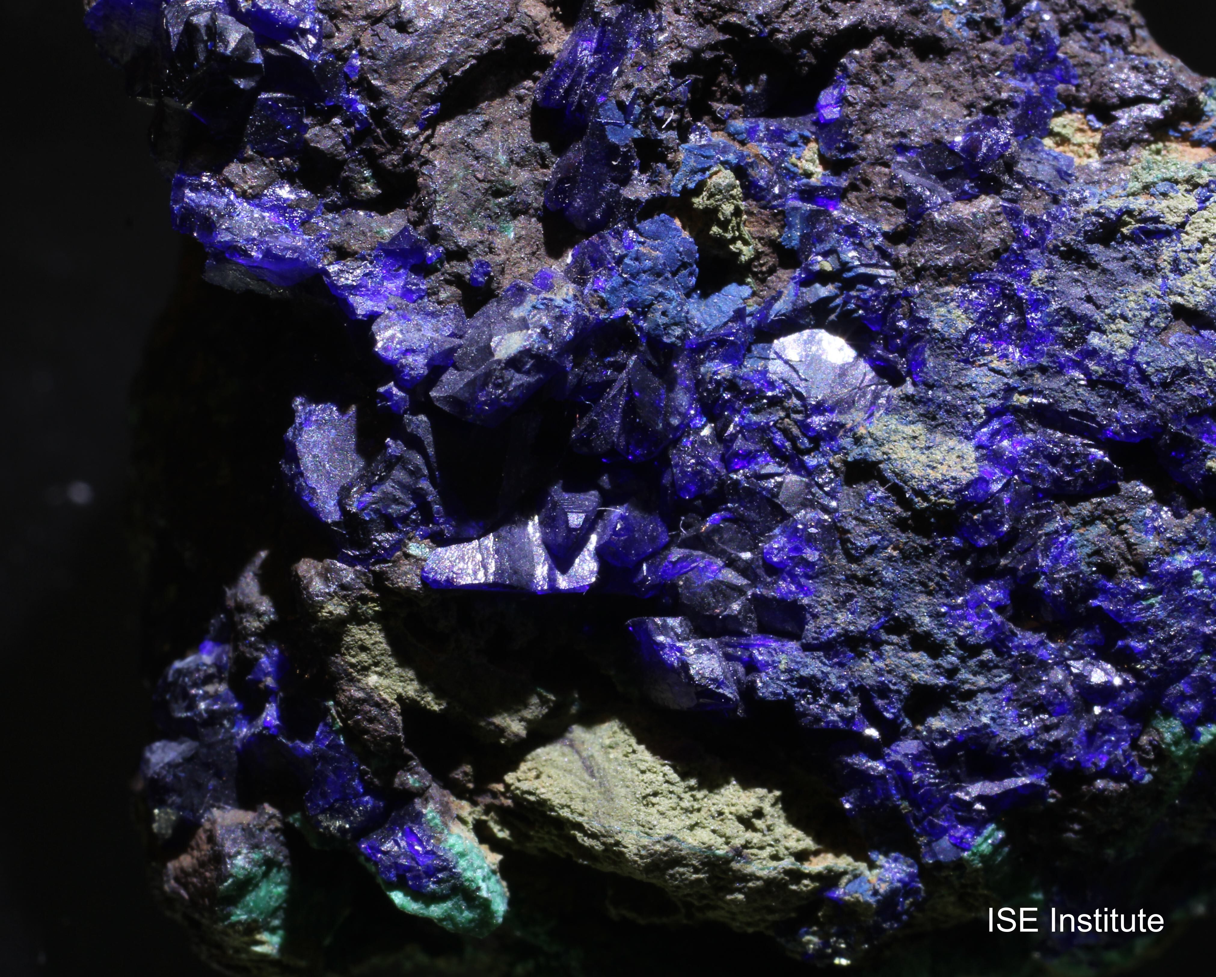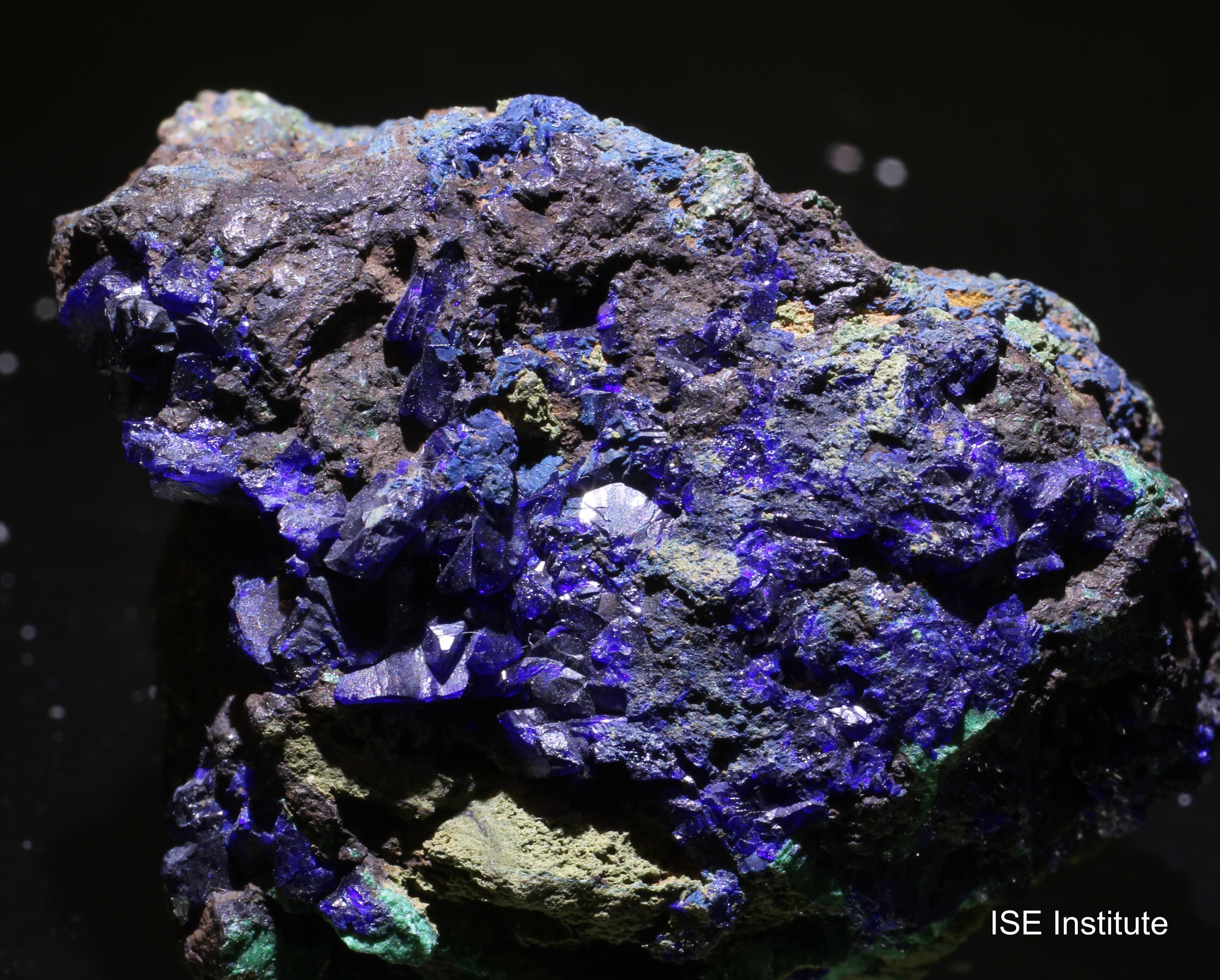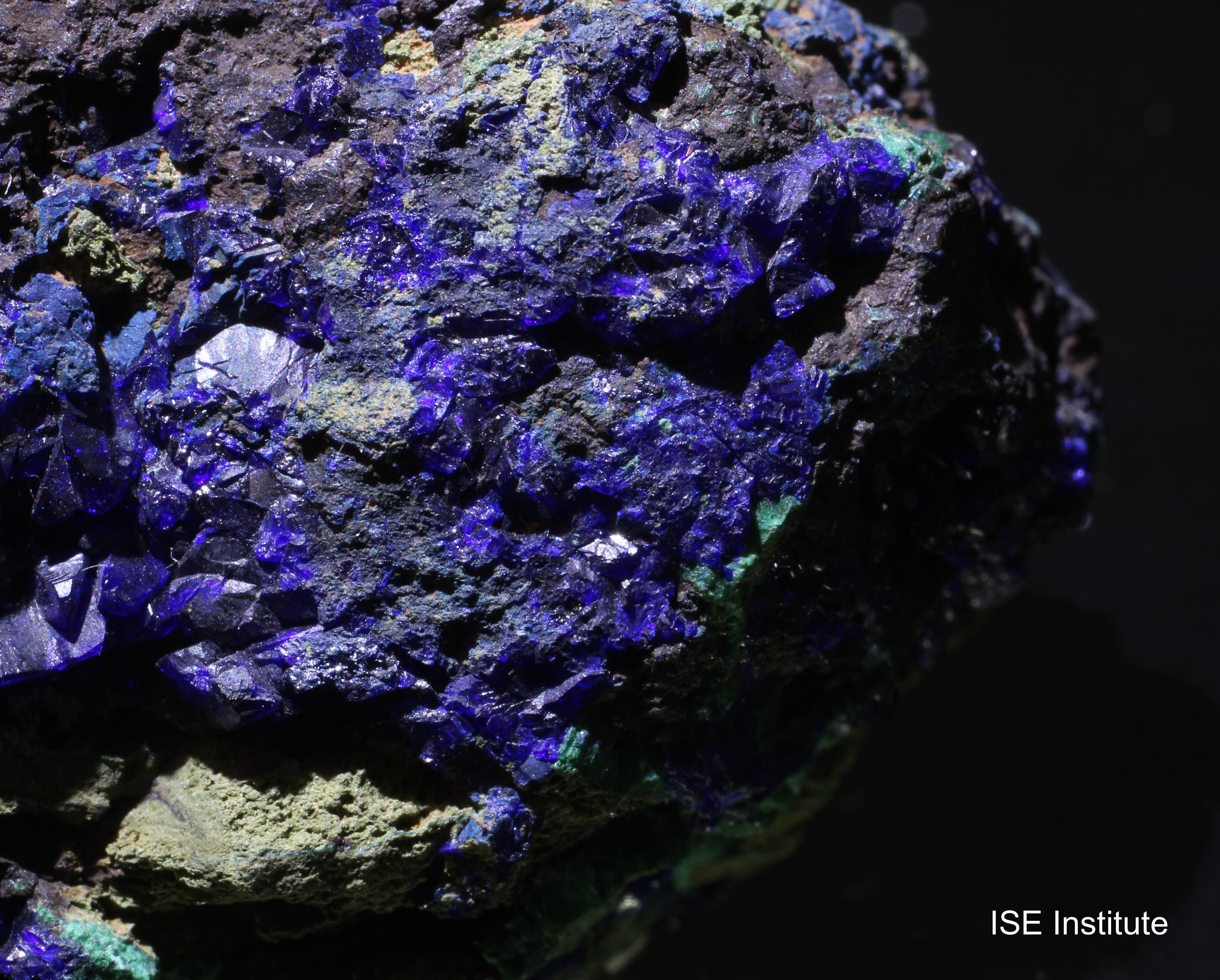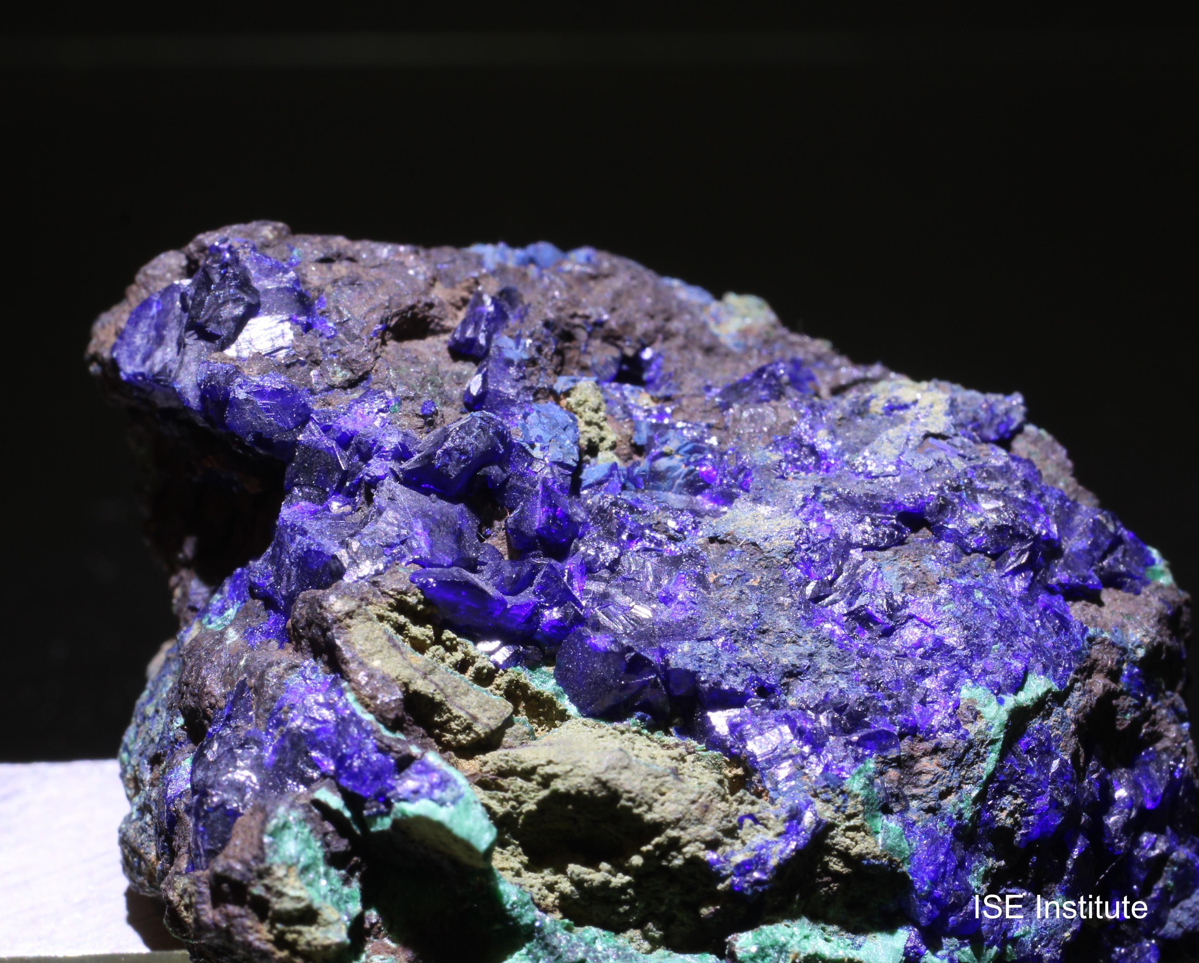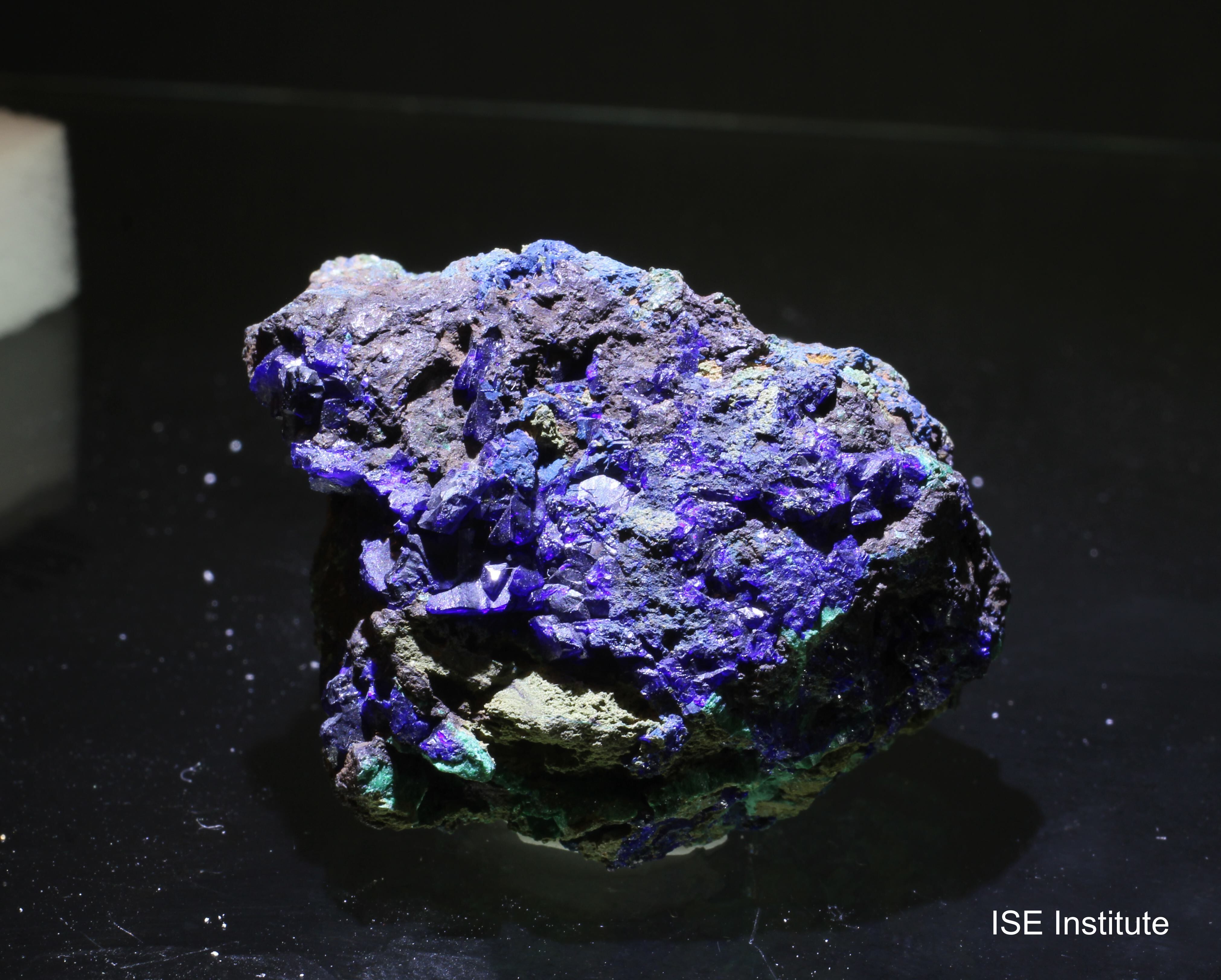 本品は、高グレードのアズライト結晶とはえいないものの、部分的に結晶がみえ、アズライトの色合いがよくわかります。緑色の部分はマラカイトです。