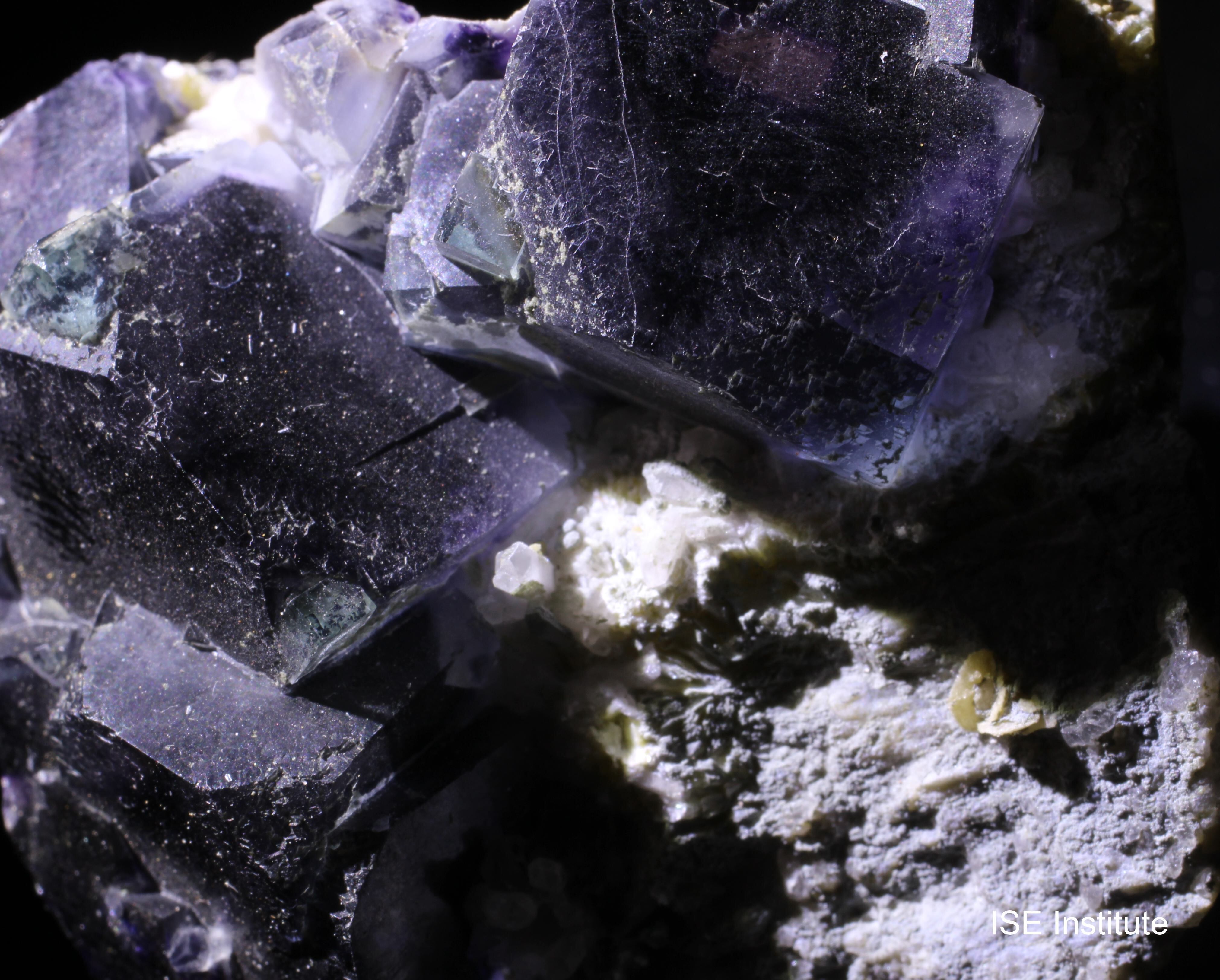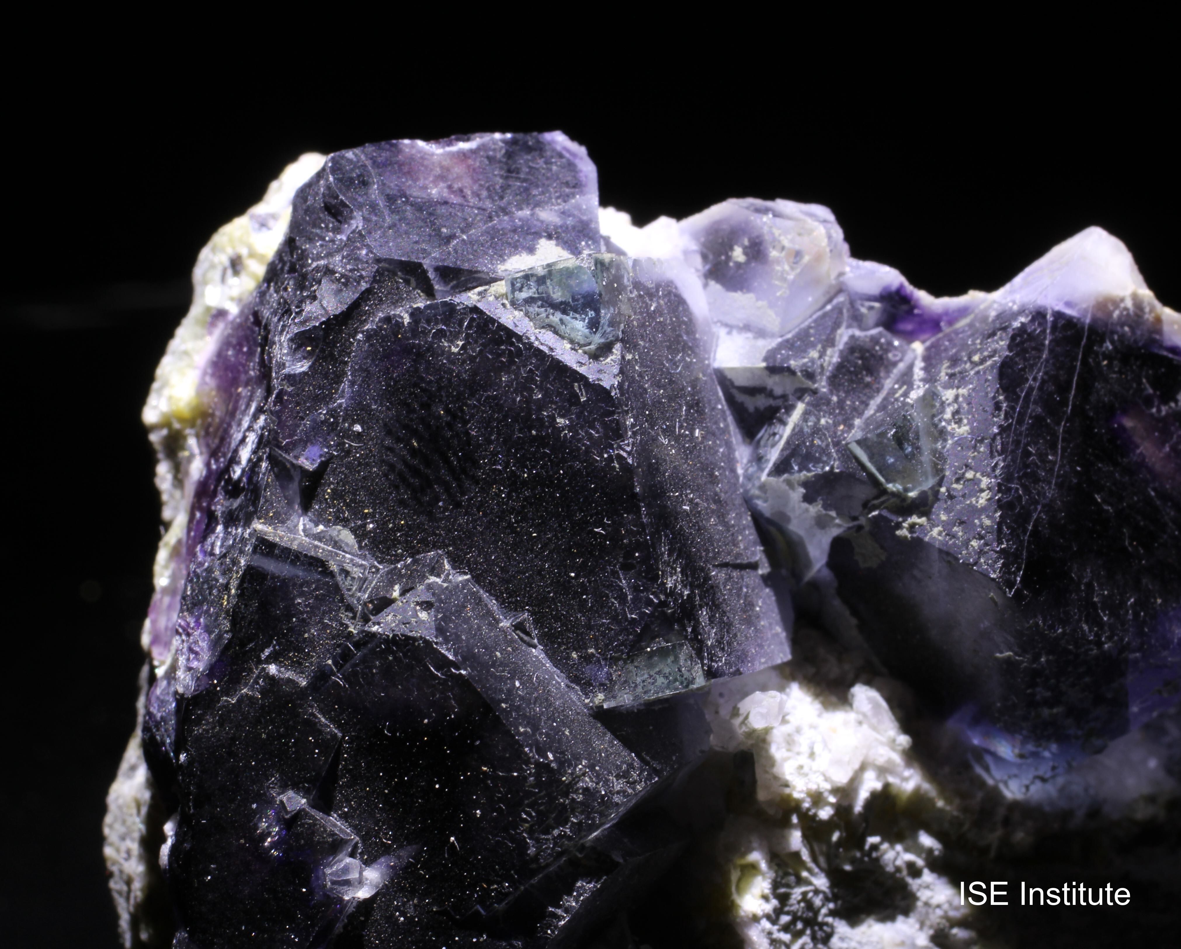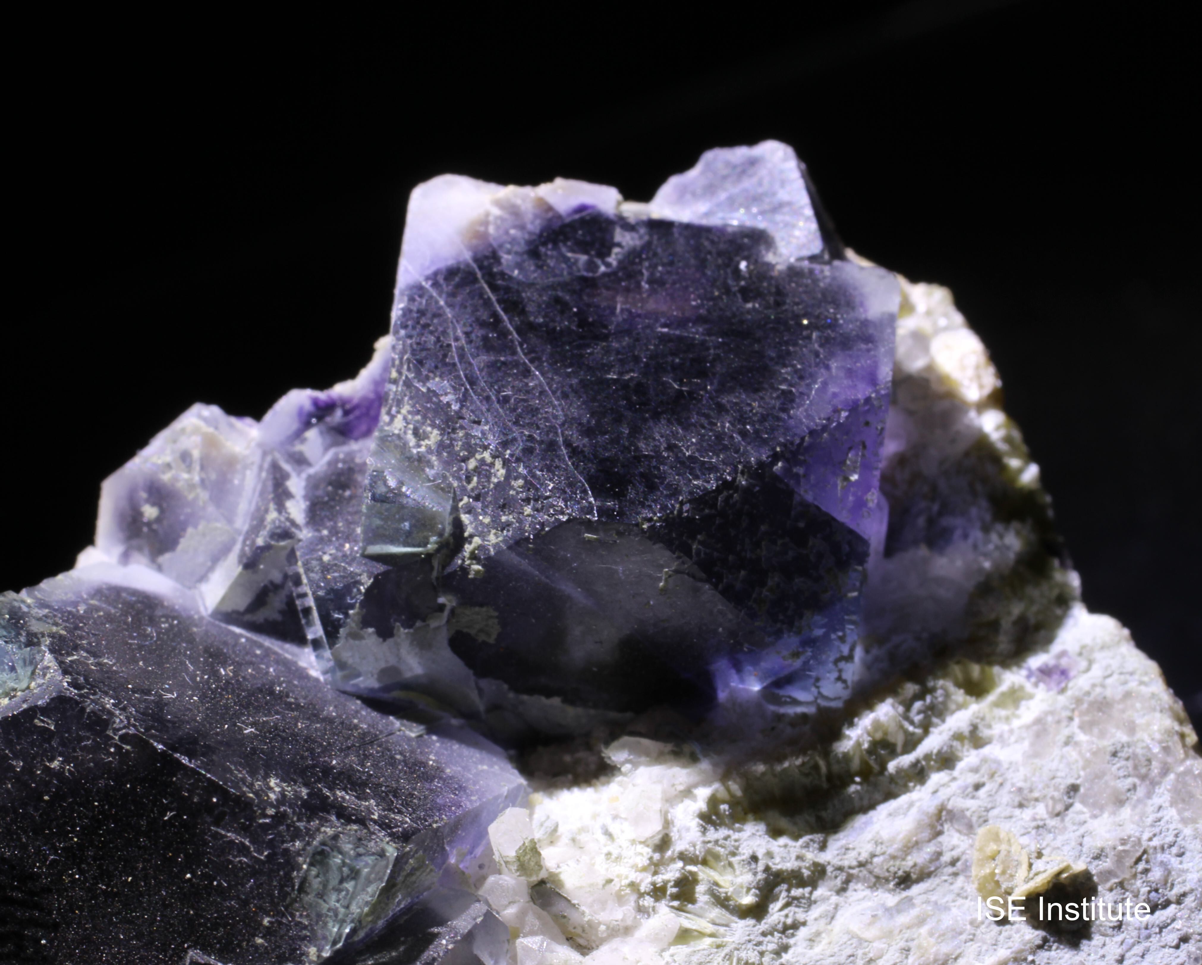 内モンゴル自治区チーフェン市ヘシグテン旗のインドゥ鉱山産蛍石は、紫や緑のゾーニングやファントム構造が特徴的で、カルサイトや白雲母を伴う産状がよく知られています。