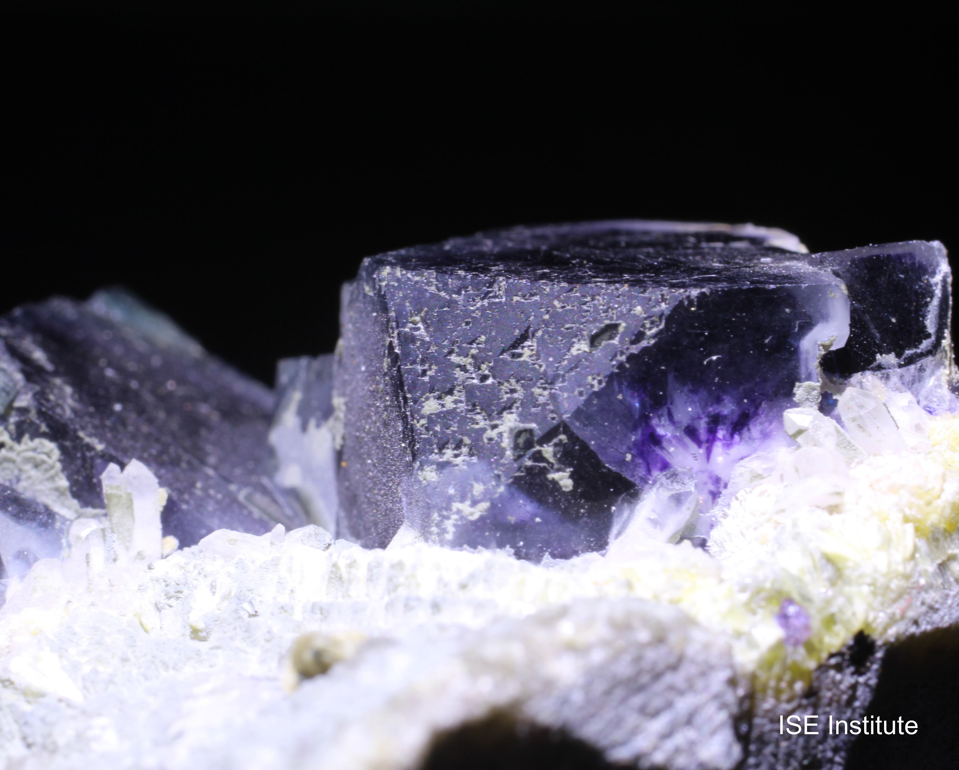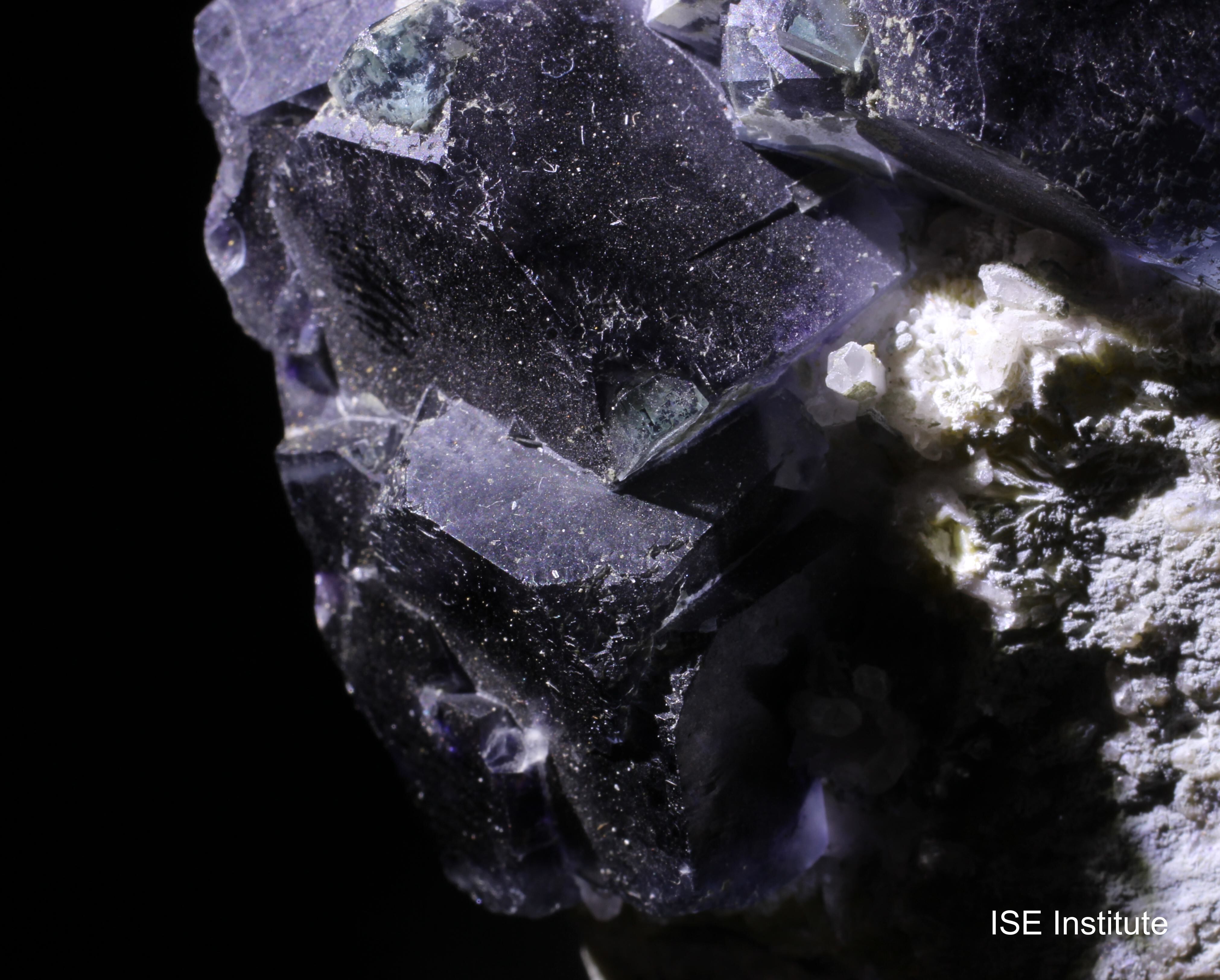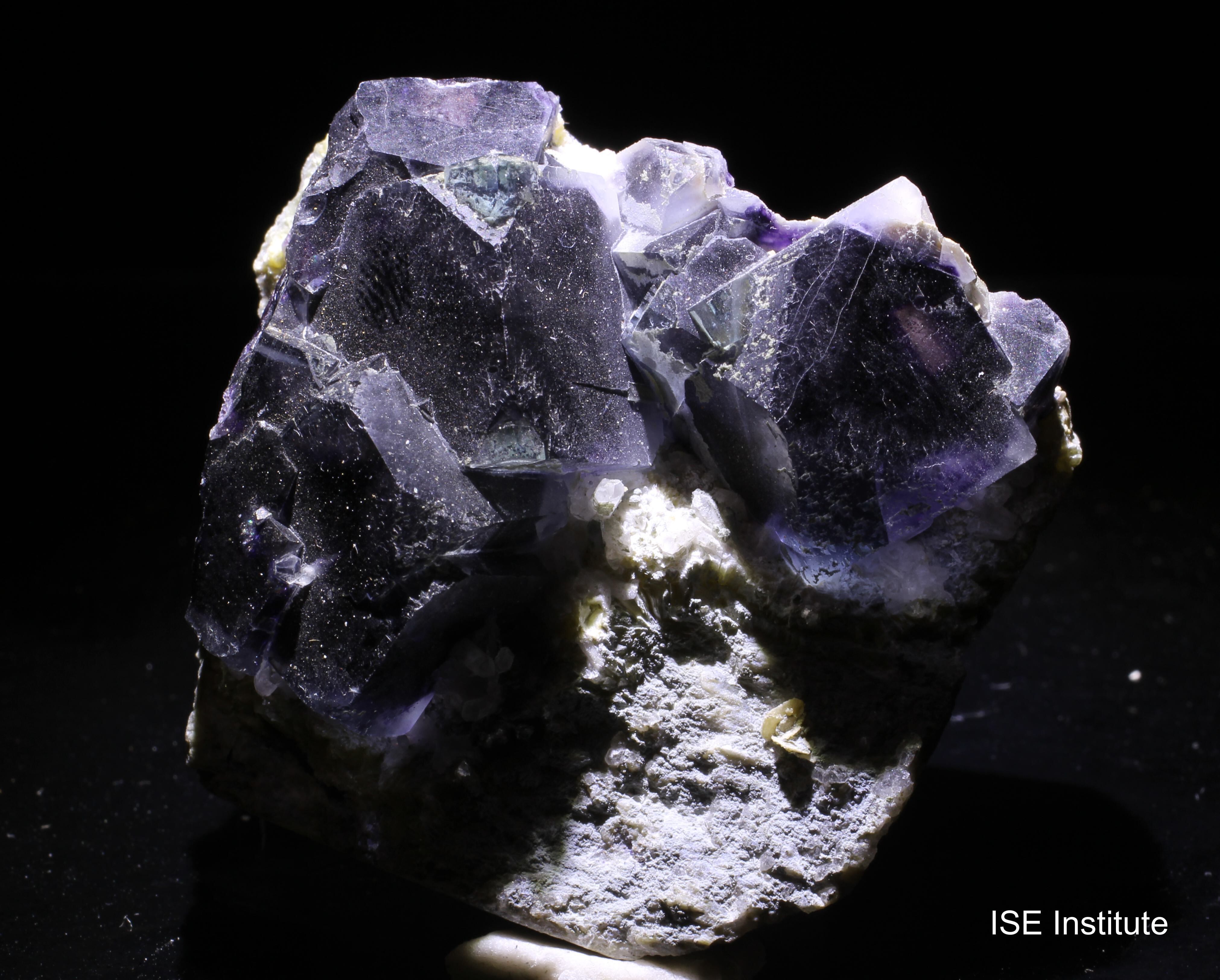 内モンゴル自治区チーフェン市ヘシグテン旗のインドゥ鉱山産蛍石は、紫や緑のゾーニングやファントム構造が特徴的で、カルサイトや白雲母を伴う産状がよく知られています。
