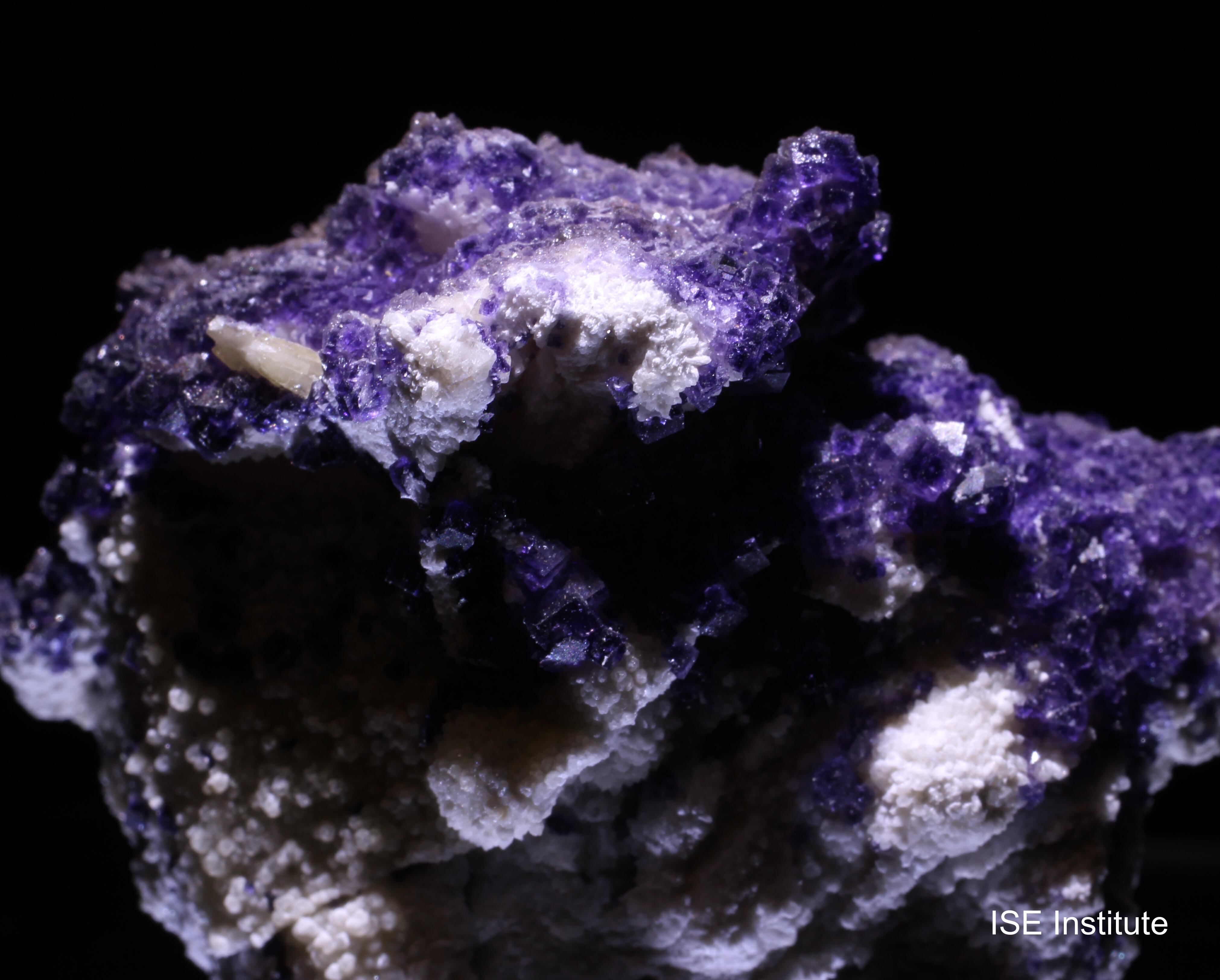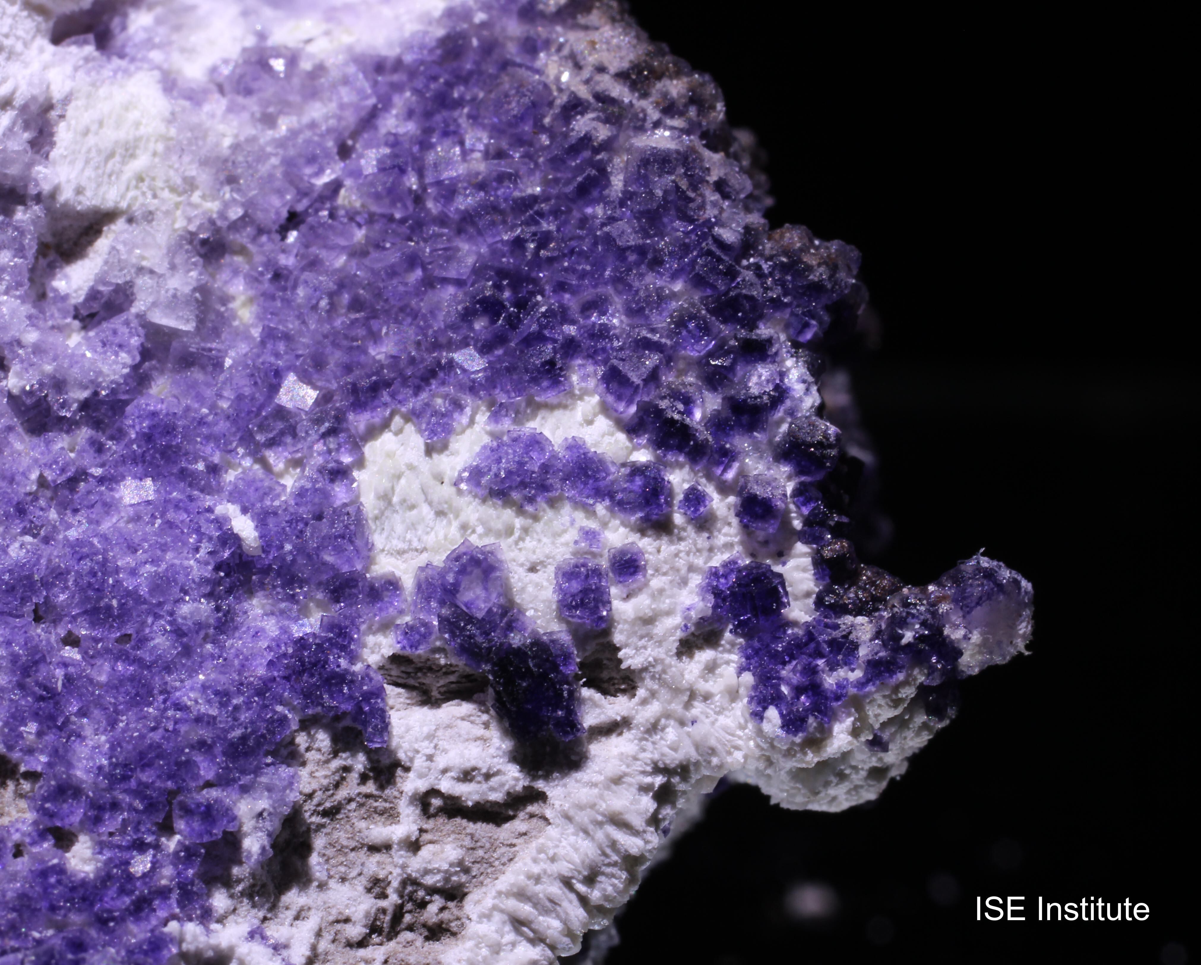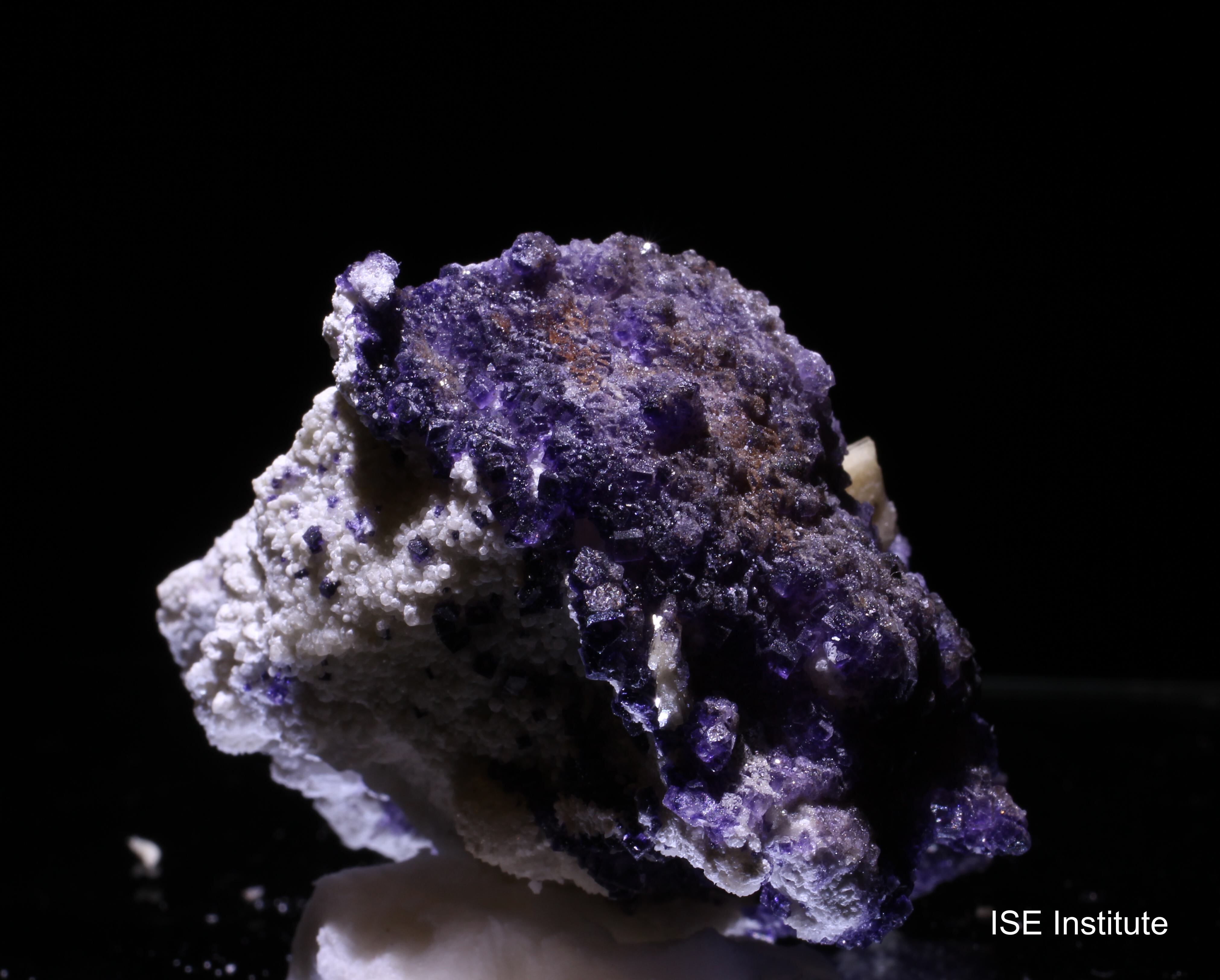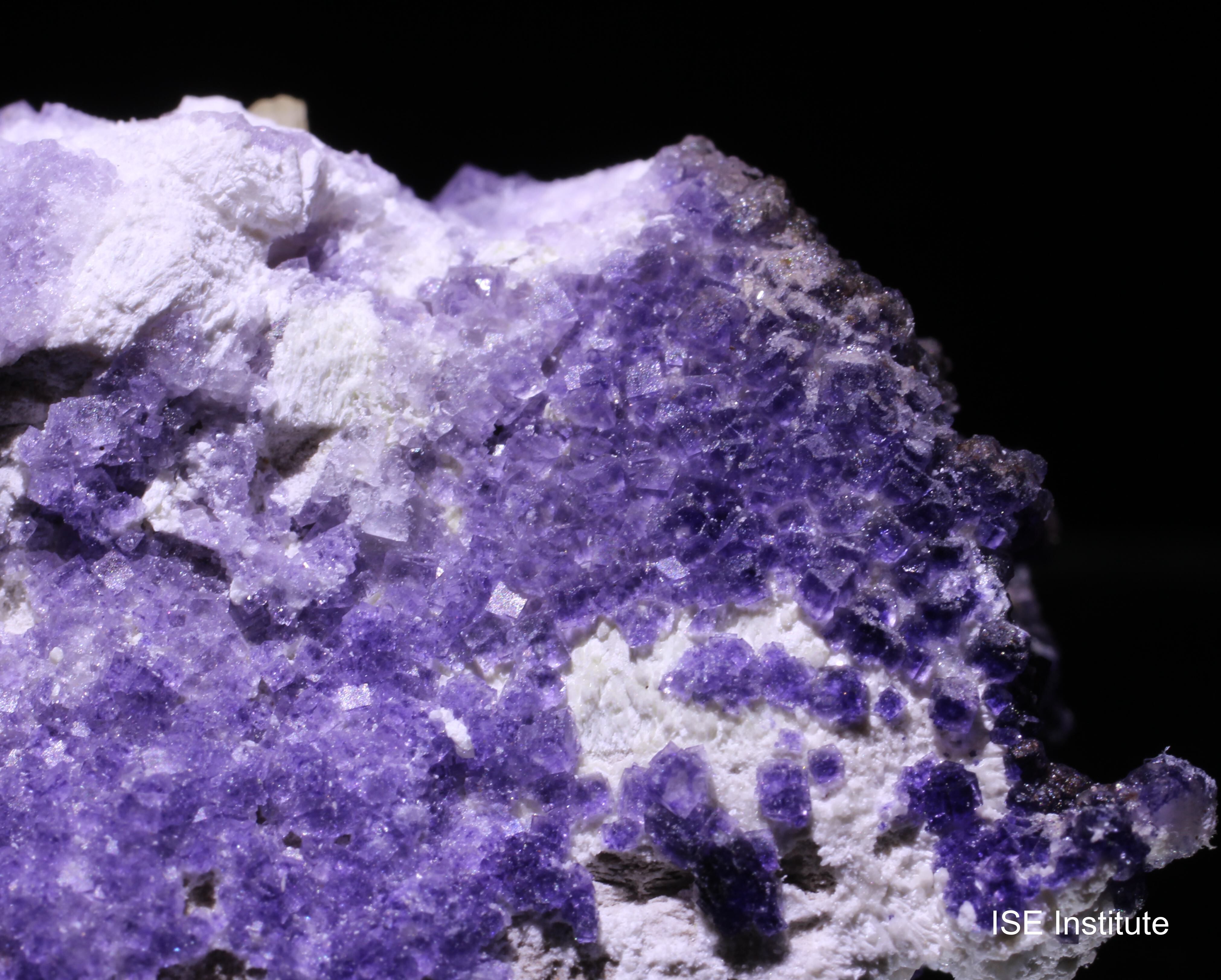 貴州省のダーチャン鉱山(チンロン鉱山)は、大規模なアンチモン鉱床として知られ、蛍石は炭酸塩岩を母岩とする熱水活動の最終段階で形成されます。この産地の蛍石は、ロイヤルブルーから深いバイオレットに至るまで、非常に鮮やかで深みのある色彩を持つことで高く評価されています。これらの色彩は、フッ化カルシウムの結晶格子内に生じたカラーセンターによるもので、鉱化過程における自然放射線や微量元素の置換が影響しているといわれます。 ダーチャン産の蛍石における最大の鉱物学的特徴は、累帯構造(ゾーニング)です。熱水環境の周期的な変動により、一つの立方体結晶の中に青色や紫色の層が形成されます。本標本はこれらの立方体結晶の群生(クラスター)です。