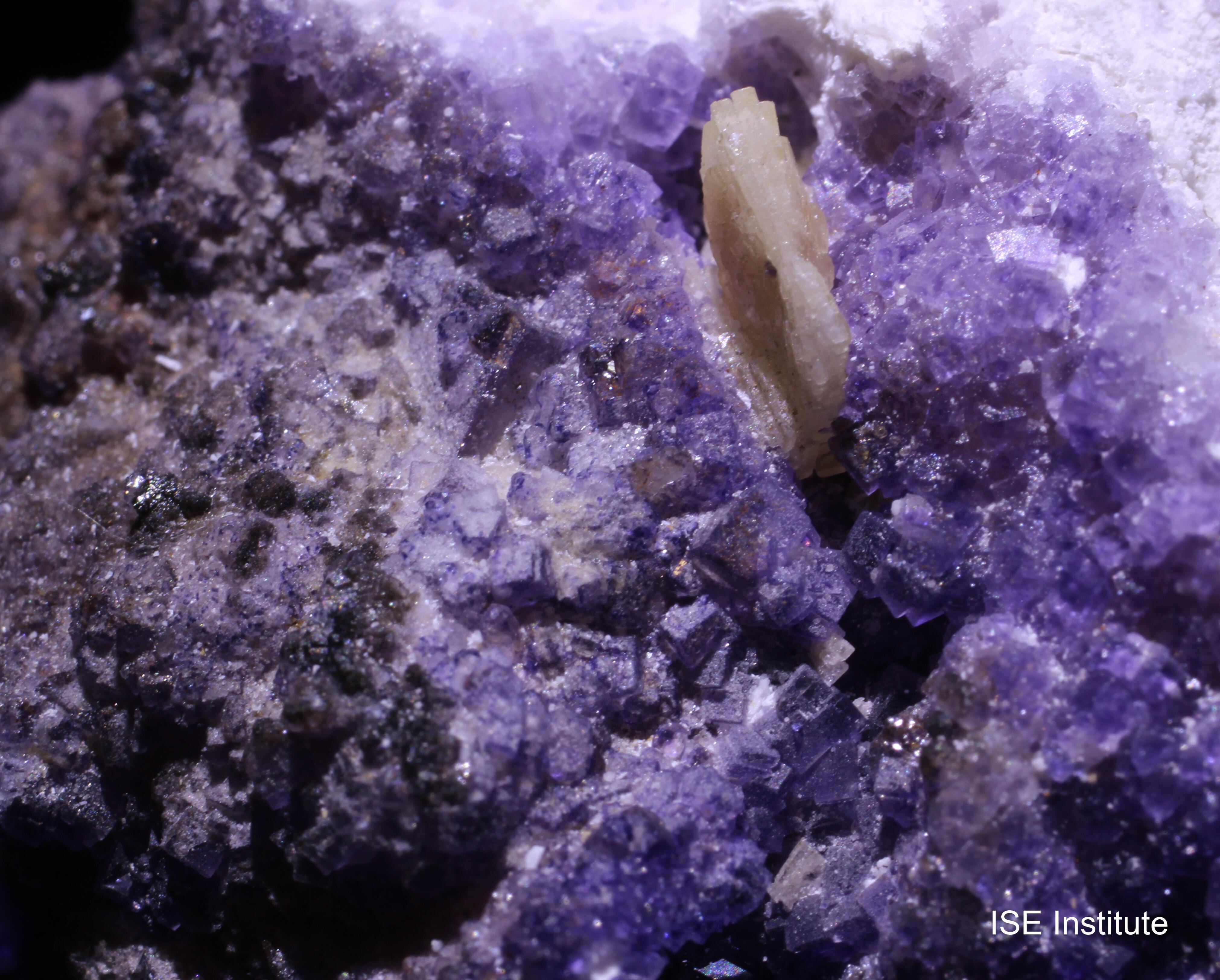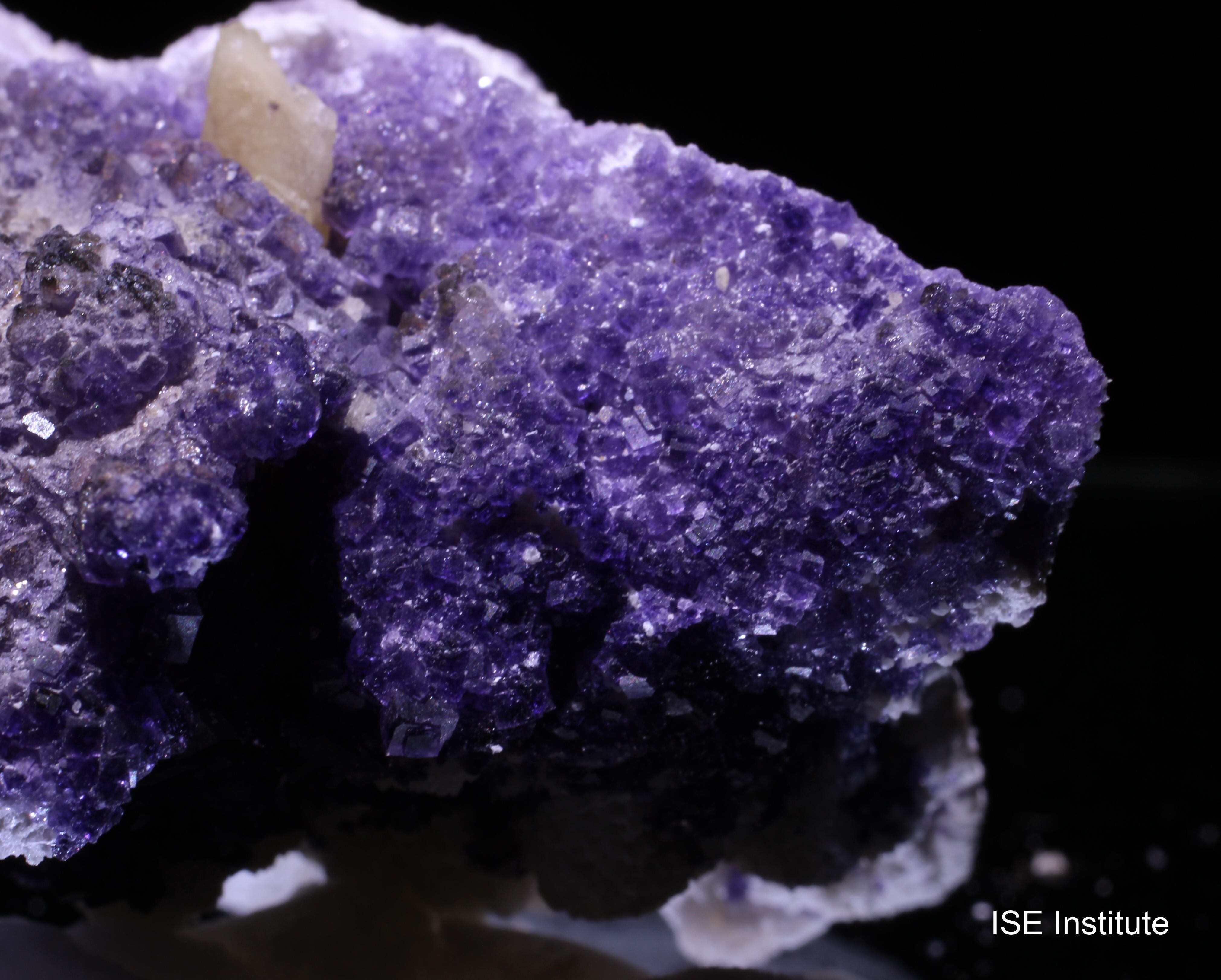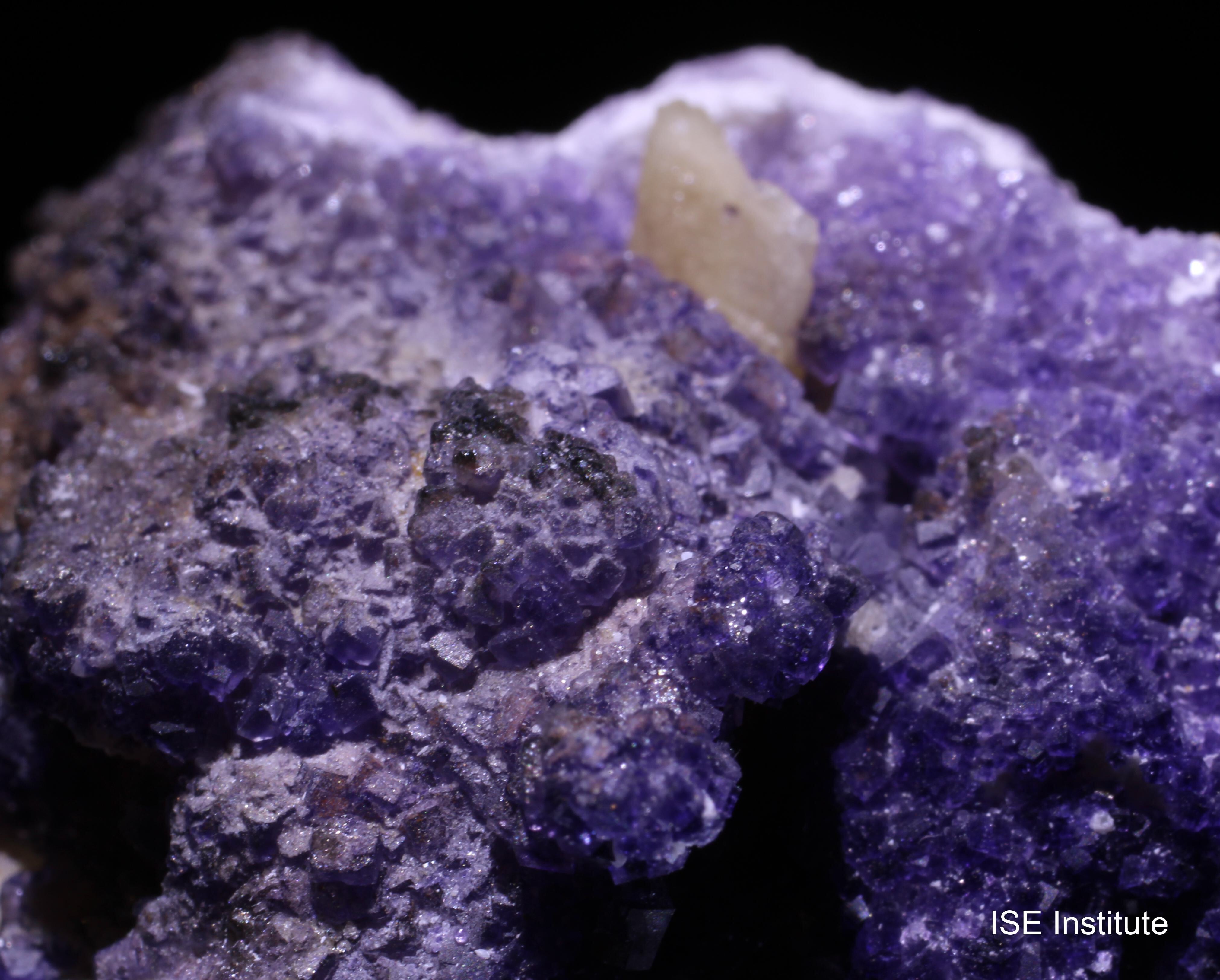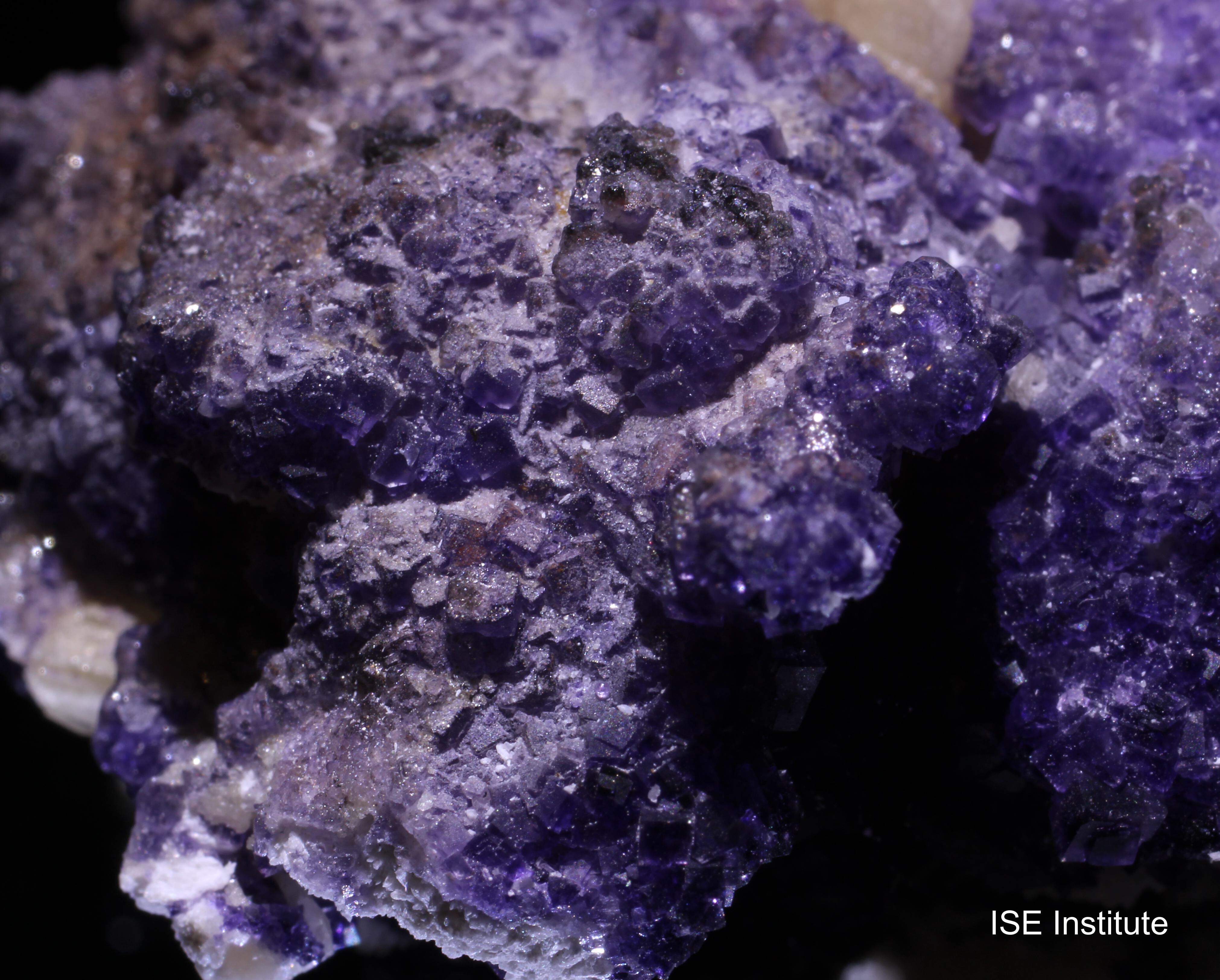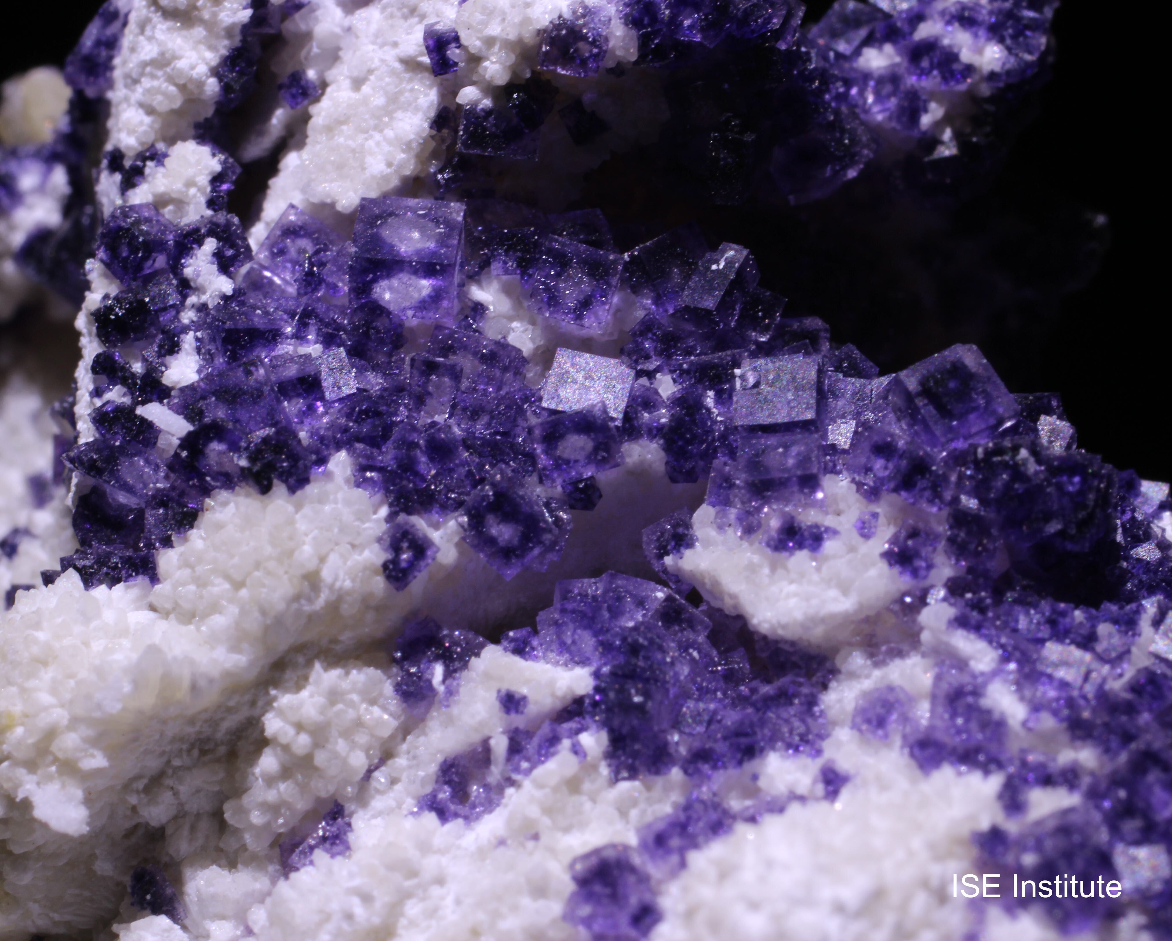 貴州省のダーチャン鉱山(チンロン鉱山)は、大規模なアンチモン鉱床として知られ、蛍石は炭酸塩岩を母岩とする熱水活動の最終段階で形成されます。この産地の蛍石は、ロイヤルブルーから深いバイオレットに至るまで、非常に鮮やかで深みのある色彩を持つことで高く評価されています。これらの色彩は、フッ化カルシウムの結晶格子内に生じたカラーセンターによるもので、鉱化過程における自然放射線や微量元素の置換が影響しているといわれます。 ダーチャン産の蛍石における最大の鉱物学的特徴は、累帯構造(ゾーニング)です。熱水環境の周期的な変動により、一つの立方体結晶の中に青色や紫色の層が形成されます。本標本はこれらの立方体結晶の群生(クラスター)です。