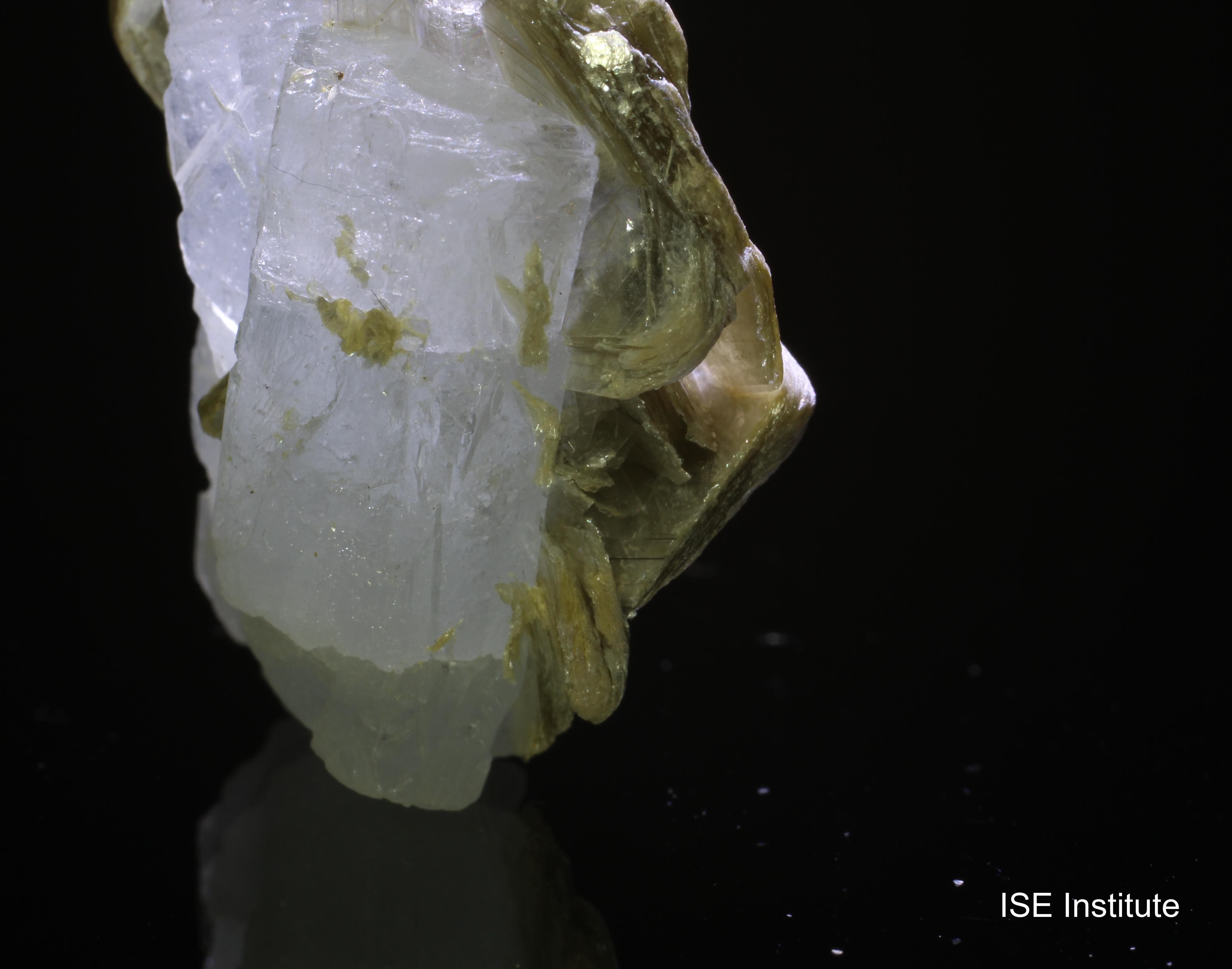 特に白雲母との共生が明確に観察できる点が注目されます。白雲母の薄い層と緑柱石の透明な結晶が調和し、美しい対比を生み出しています。また、結晶トップがフラットである点も、成長環境を示唆するユニークな特徴です。こうしたフラットなトップは、結晶形成時の温度変化や圧力条件を反映していると考えられます。