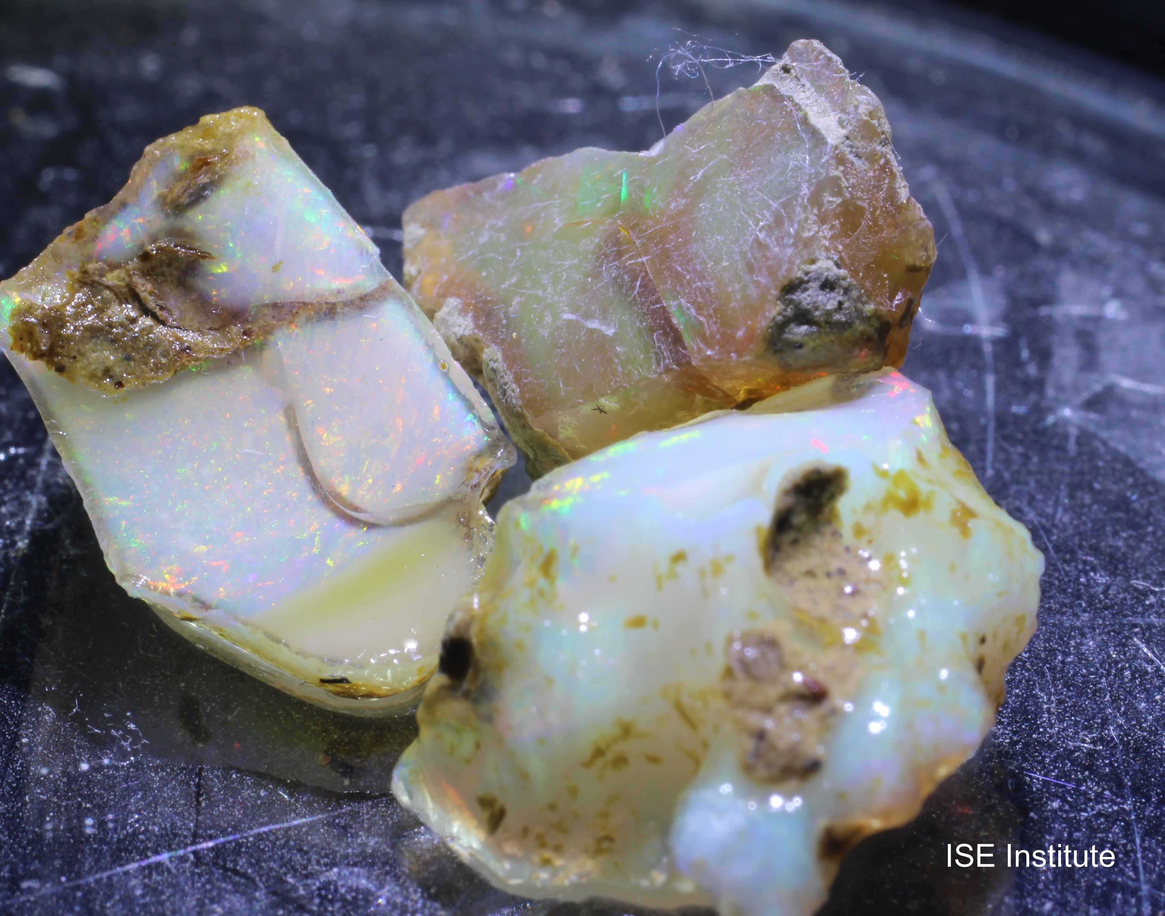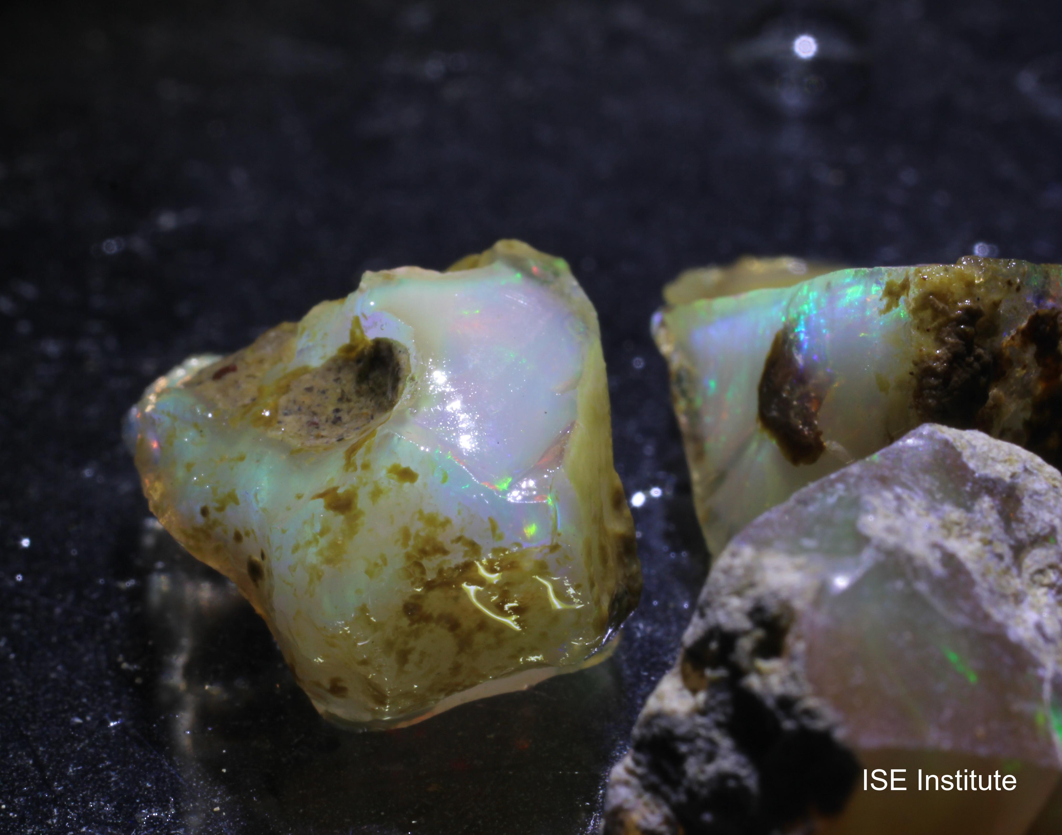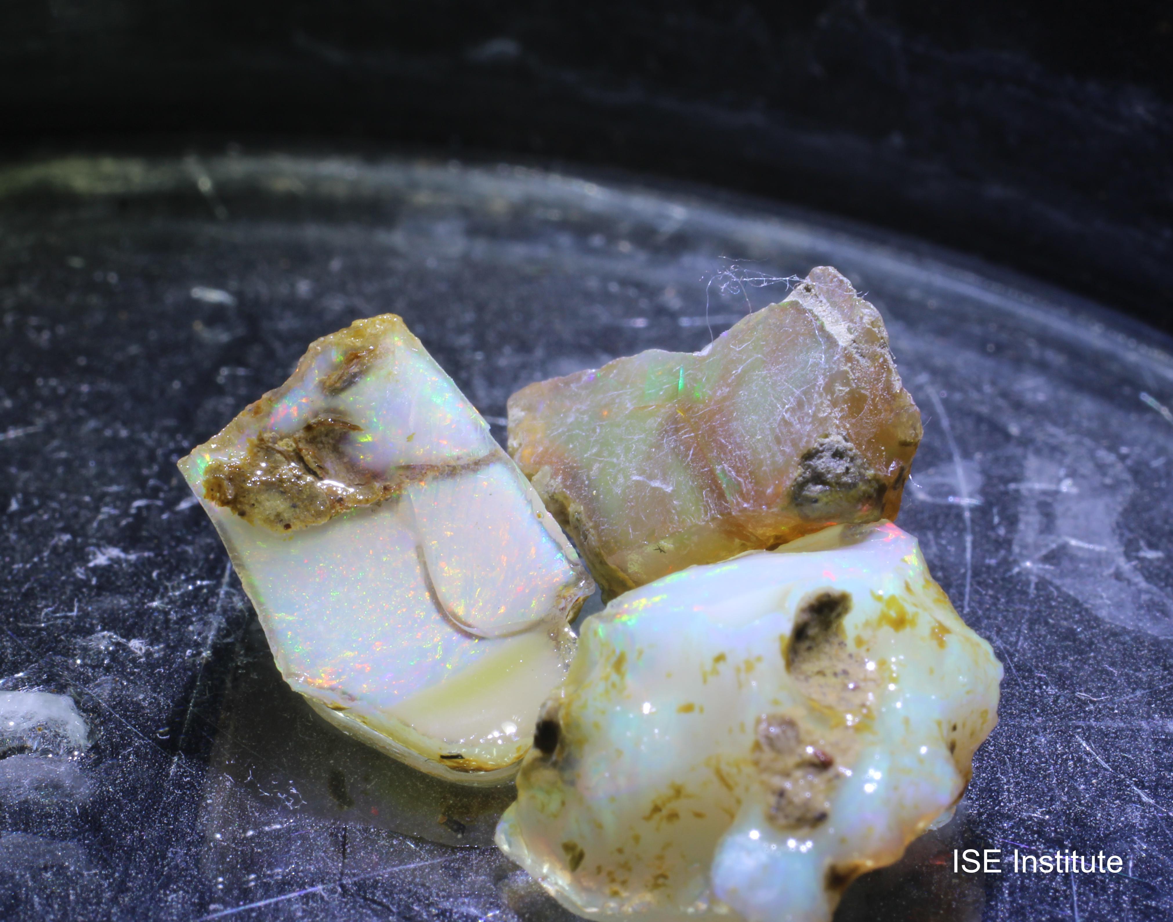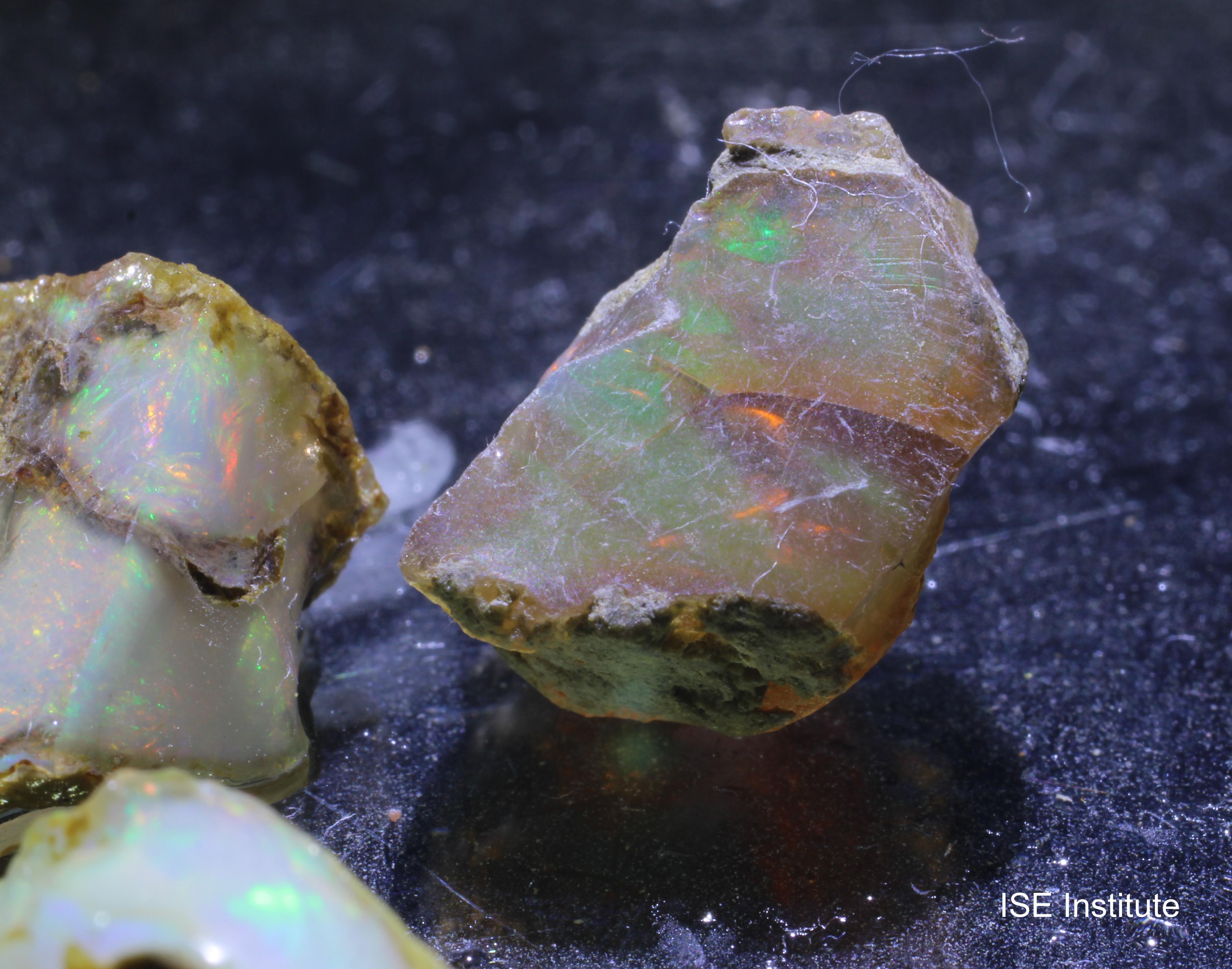 メンズギシ地区、北ショワ地方、エチオピア産のオパールは、その美しい色彩と独特の輝きで広く知られています。いわゆるエチオピアオパールです。 オパールは、二酸化ケイ素を含む水和鉱物で、しばしば内部に美しい虹色の光を反射する特性を持っています。この鉱物は、しばしば乳白色から透明までの色合いを持ち、その内部に微細な球状構造を形成することで、遊色効果を引き起こします。